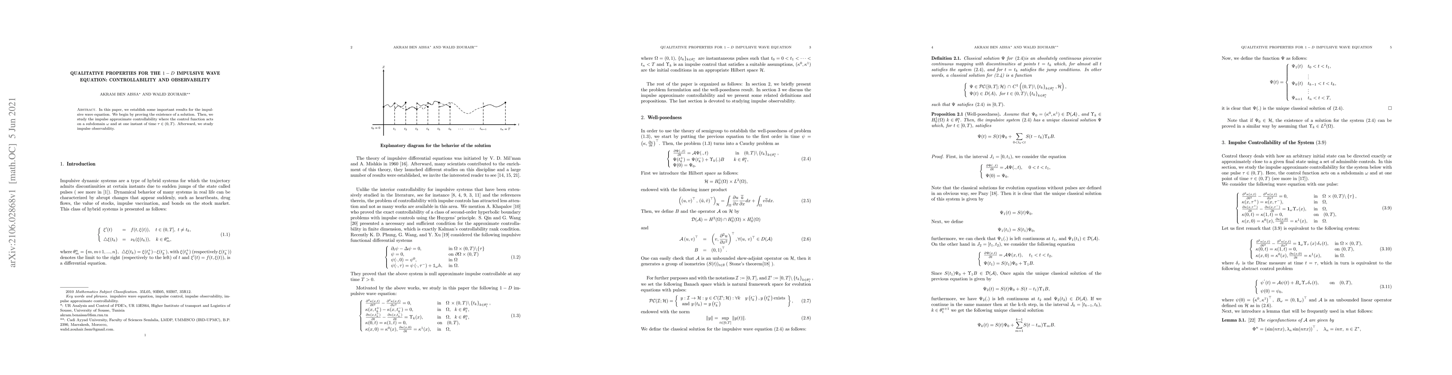 This paper investigates the qualitative properties of the 1-D impulsive wave equation, proving the existence of solutions and exploring impulse approximate controllability and observability where control functions act on a subdomain at a specific time.