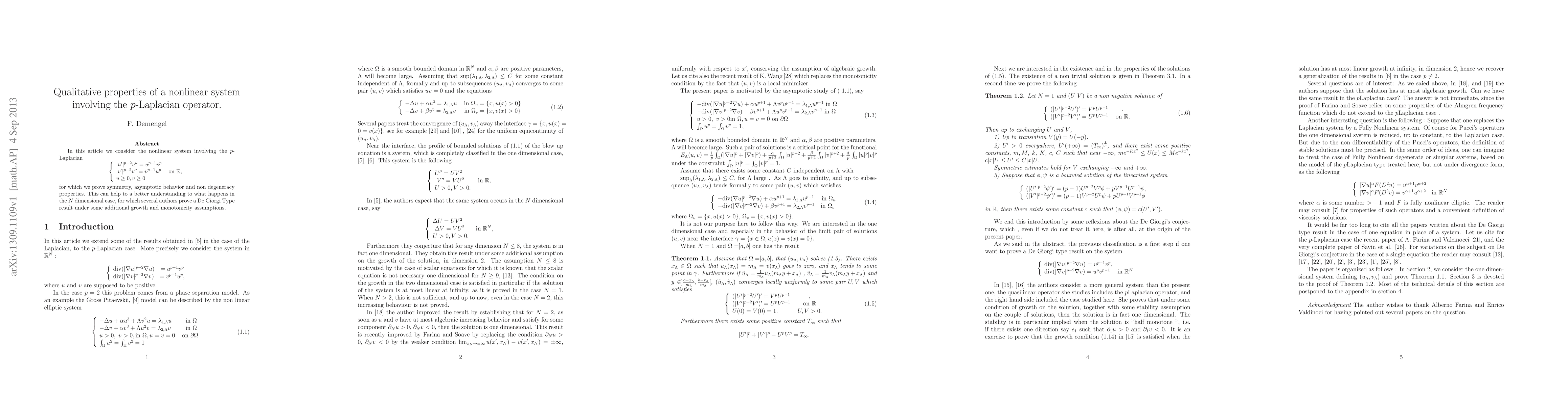 This research paper investigates a nonlinear system involving the $p$-Laplacian operator, proving symmetry, asymptotic behavior, and non-degeneracy properties to better understand its behavior in higher dimensions.