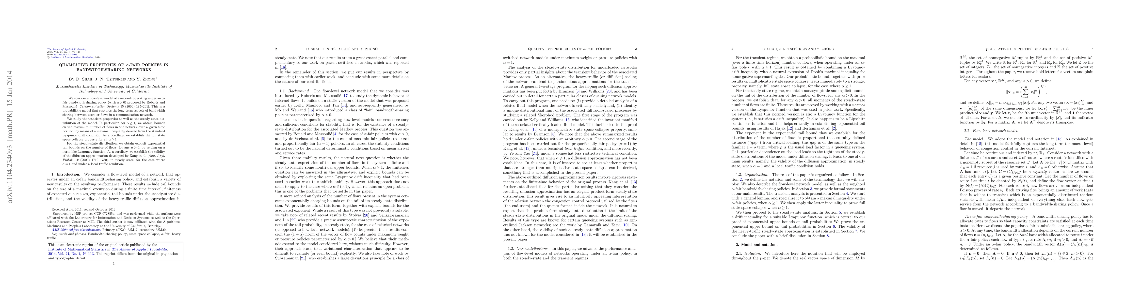 This paper investigates the qualitative properties of $\alpha$-fair bandwidth sharing policies in networks, focusing on transient and steady-state behaviors. It establishes bounds on the maximum number of flows and proves the full state space collapse property for $\alpha\geq1$, along with exponential tail bounds for the steady-state distribution, validating the diffusion approximation for $\alpha=1$.