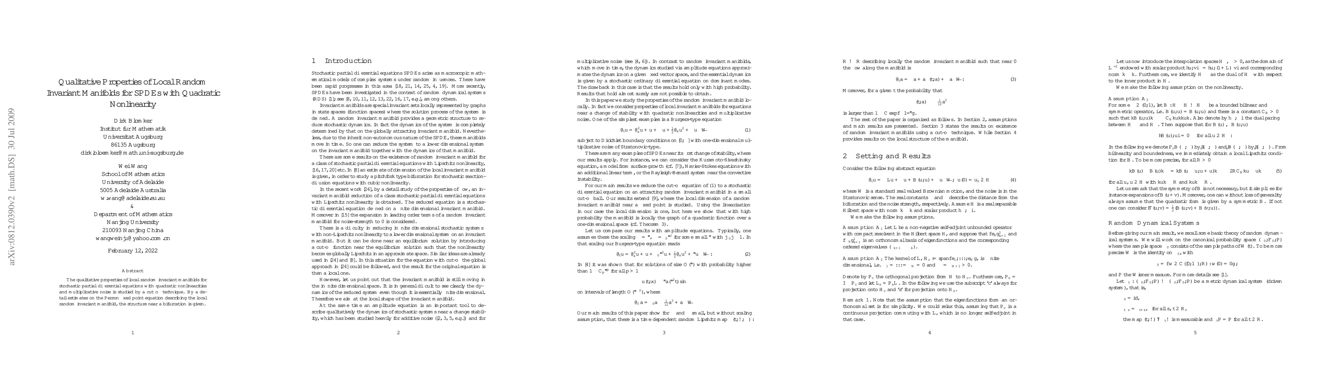 This paper investigates the qualitative properties of local random invariant manifolds in stochastic partial differential equations with quadratic nonlinearities and multiplicative noise, employing a cutoff technique. Detailed estimates on the Perron fixed point equation reveal the structure near bifurcation points.