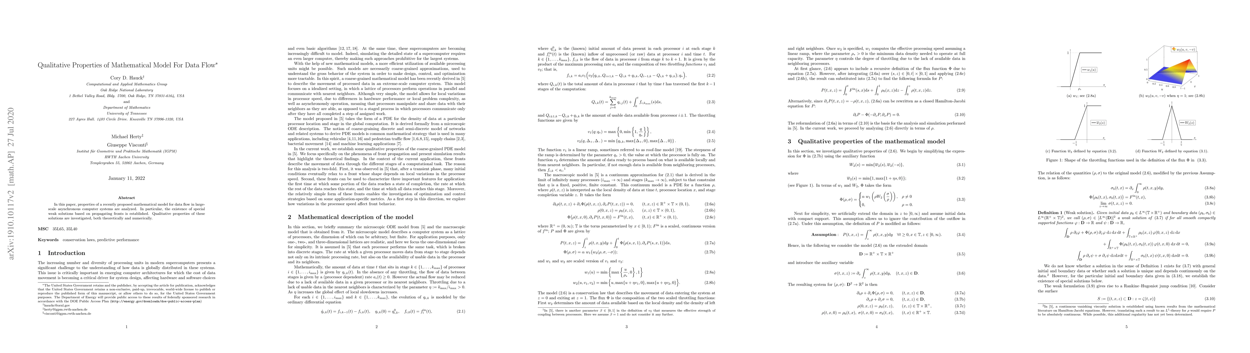 In this paper, properties of a recently proposed mathematical model for data flow in large-scale asynchronous computer systems are analyzed. In particular, the existence of special weak solutions based on propagating fronts is established. Qualitative properties of these solutions are investigated, both theoretically and numerically.