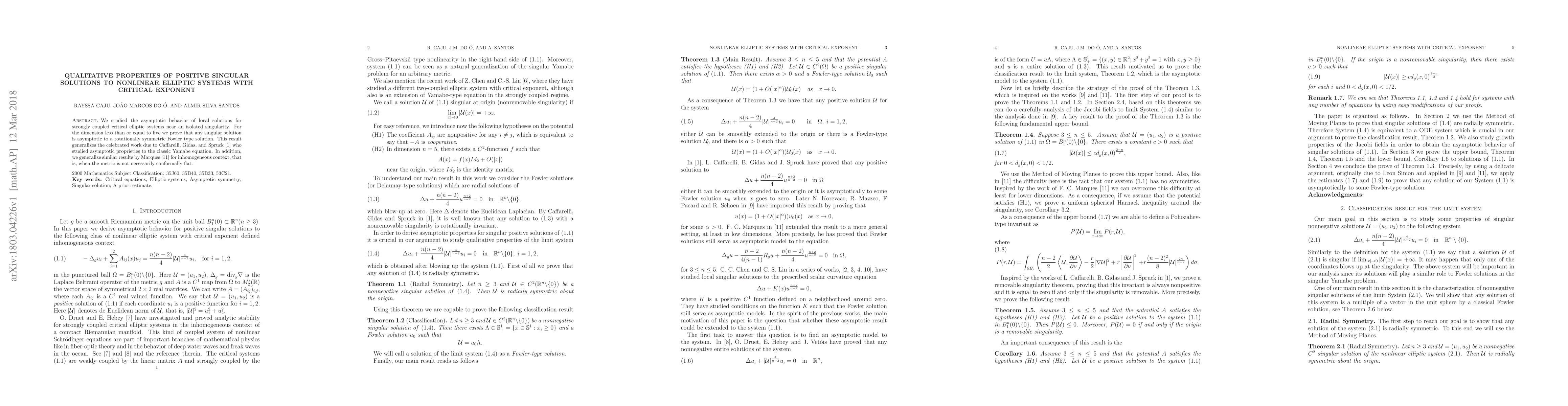 This paper studies the asymptotic behavior of singular solutions to critical elliptic systems in dimensions less than or equal to 5, showing that they approach rotationally symmetric Fowler type solutions.