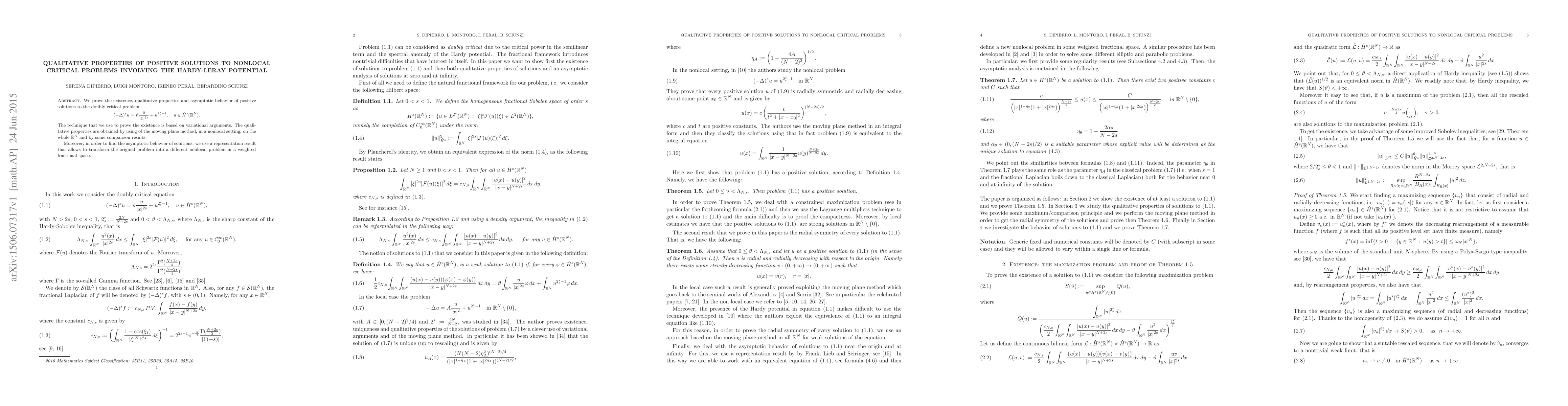 We prove the existence, qualitative properties and asymptotic behavior of positive solutions to the doubly critical problem $$ (-\Delta)^s u=\vartheta\frac{u}{|x|^{2s}}+u^{2_s^*-1}, \quad u\in \dot{H}^s(\mathbb{R}^N).$$ The technique that we use to prove the existence is based on variational arguments. The qualitative properties are obtained by using of the moving plane method, in a nonlocal setting, on the whole $\mathbb{R}^N$ and by some comparison results. Moreover, in order to find the asymptotic behavior of solutions, we use a representation result that allows to transform the original problem into a different nonlocal problem in a weighted fractional space.
