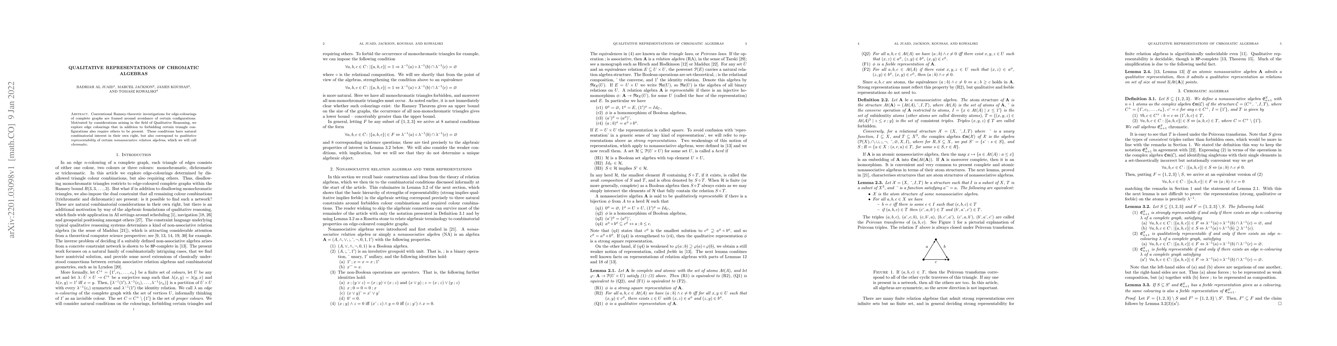 Conventional Ramsey-theoretic investigations for edge-colourings of complete graphs are framed around avoidance of certain configurations. Motivated by considerations arising in the field of Qualitative Reasoning, we explore edge colourings that in addition to forbidding certain triangle configurations also require others to be present. These conditions have natural combinatorial interest in their own right, but also correspond to qualitative representability of certain nonassociative relation algebras, which we will call chromatic.