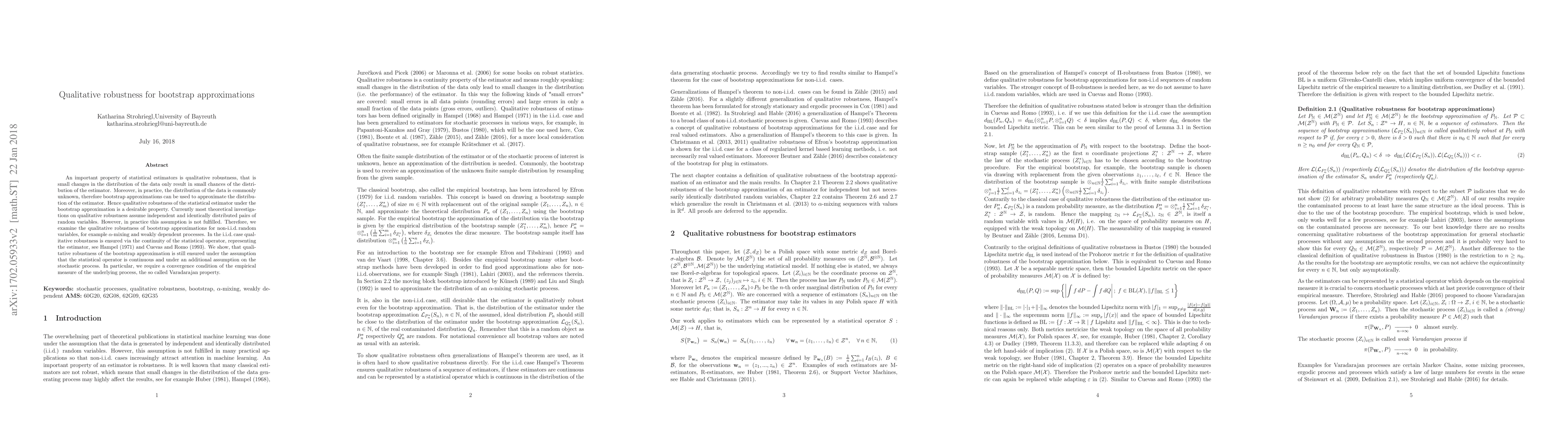 An important property of statistical estimators is qualitative robustness, that is small changes in the distribution of the data only result in small chances of the distribution of the estimator. Moreover, in practice, the distribution of the data is commonly unknown, therefore bootstrap approximations can be used to approximate the distribution of the estimator. Hence qualitative robustness of the statistical estimator under the bootstrap approximation is a desirable property. Currently most theoretical investigations on qualitative robustness assume independent and identically distributed pairs of random variables. However, in practice this assumption is not fulfilled. Therefore, we examine the qualitative robustness of bootstrap approximations for non-i.i.d. random variables, for example $\alpha$-mixing and weakly dependent processes. In the i.i.d. case qualitative robustness is ensured via the continuity of the statistical operator, representing the estimator, see Hampel (1971) and Cuevas and Romo (1993). We show, that qualitative robustness of the bootstrap approximation is still ensured under the assumption that the statistical operator is continuous and under an additional assumption on the stochastic process. In particular, we require a convergence condition of the empirical measure of the underlying process, the so called Varadarajan property.