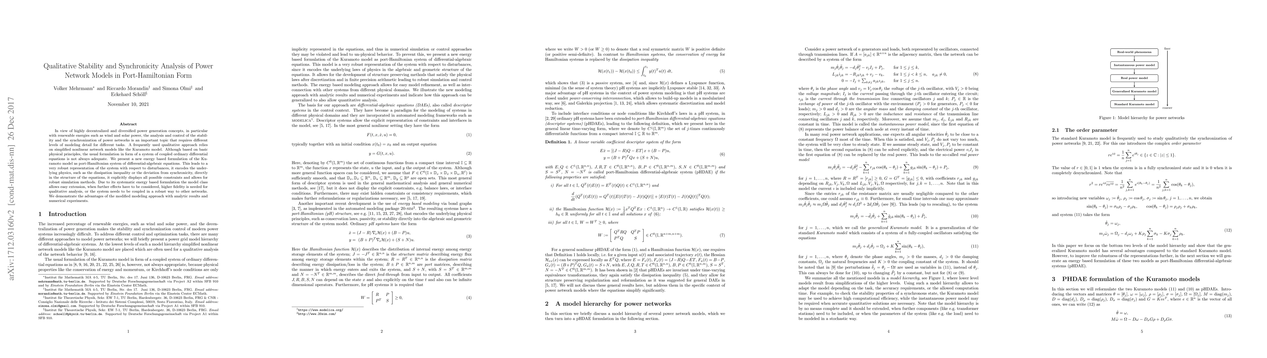In view of highly decentralized and diversified power generation concepts, in particular with renewable energies such as wind and solar power, the analysis and control of the stability and the synchronization of power networks is an important topic that requires different levels of modeling detail for different tasks. A frequently used qualitative approach relies on simplified nonlinear network models like the Kuramoto model. Although based on basic physical principles, the usual formulation in form of a system of coupled ordinary differential equations is not always adequate. We present a new energy-based formulation of the Kuramoto model as port-Hamiltonian system of differential-algebraic equations. This leads to a very robust representation of the system with respect to disturbances, it encodes the underlying physics, such as the dissipation inequality or the deviation from synchronicity, directly in the structure of the equations, it explicitly displays all possible constraints and allows for robust simulation methods. Due to its systematic energy based formulation the model class allows easy extension, when further effects have to be considered, higher fidelity is needed for qualitative analysis, or the system needs to be coupled in a robust way to other networks. We demonstrate the advantages of the modified modeling approach with analytic results and numerical experiments.