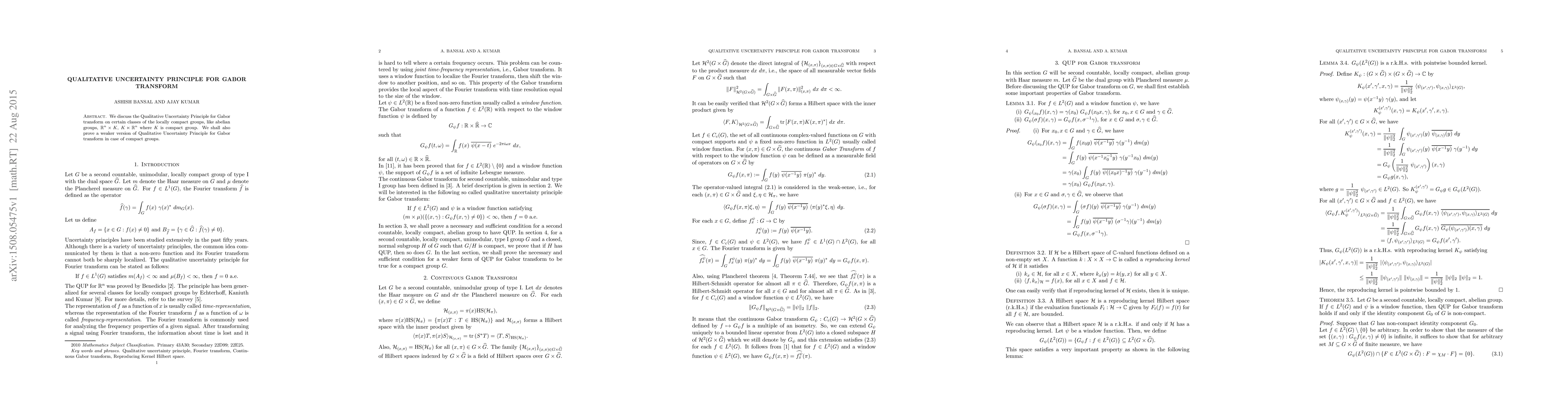 The paper investigates the Qualitative Uncertainty Principle for Gabor transforms on various locally compact groups, including abelian groups and semidirect products with compact groups, proving a weaker version for compact groups.