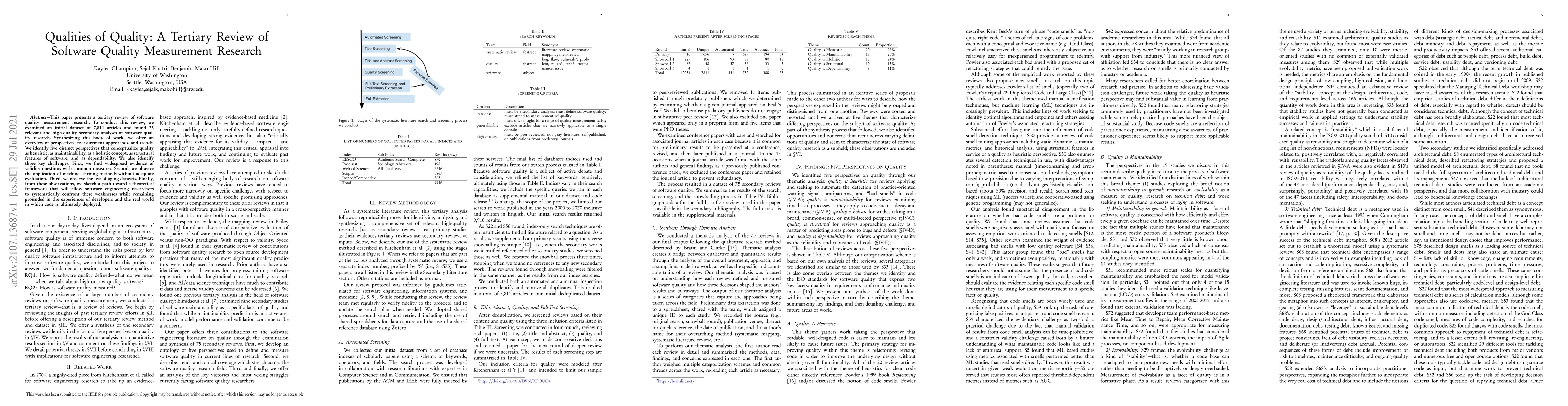 This tertiary review synthesizes 75 high-quality analyses of software quality measurement, identifying five conceptual perspectives and highlighting three key challenges: validity issues, inadequate machine learning evaluation, and reliance on aging datasets. It proposes a theoretical framework to address these weaknesses.