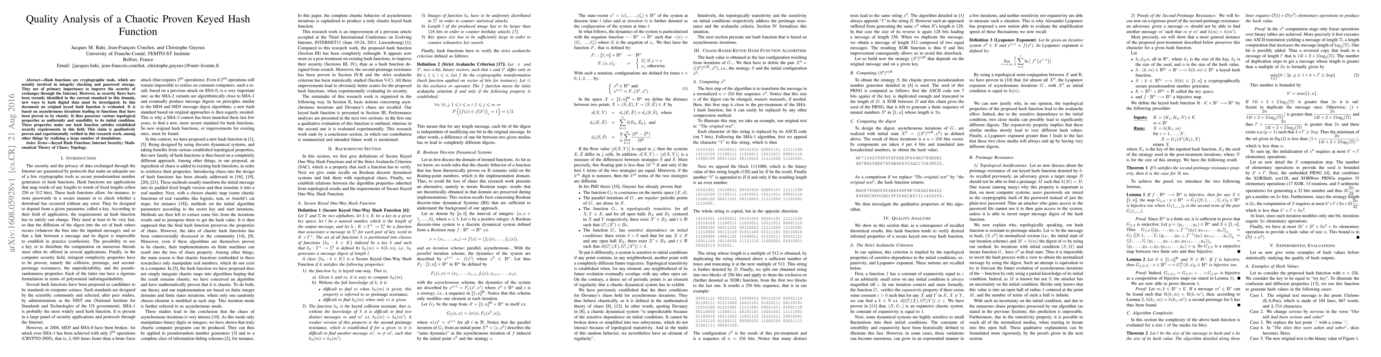 Hash functions are cryptographic tools, which are notably involved in integrity checking and password storage. They are of primary importance to improve the security of exchanges through the Internet. However, as security flaws have been recently identified in the current standard in this domain, new ways to hash digital data must be investigated. In this document an original keyed hash function is evaluated. It is based on asynchronous iterations leading to functions that have been proven to be chaotic. It thus possesses various topological properties as uniformity and sensibility to its initial condition. These properties make our hash function satisfies established security requirements in this field. This claim is qualitatively proven and experimentally verified in this research work, among other things by realizing a large number of simulations.