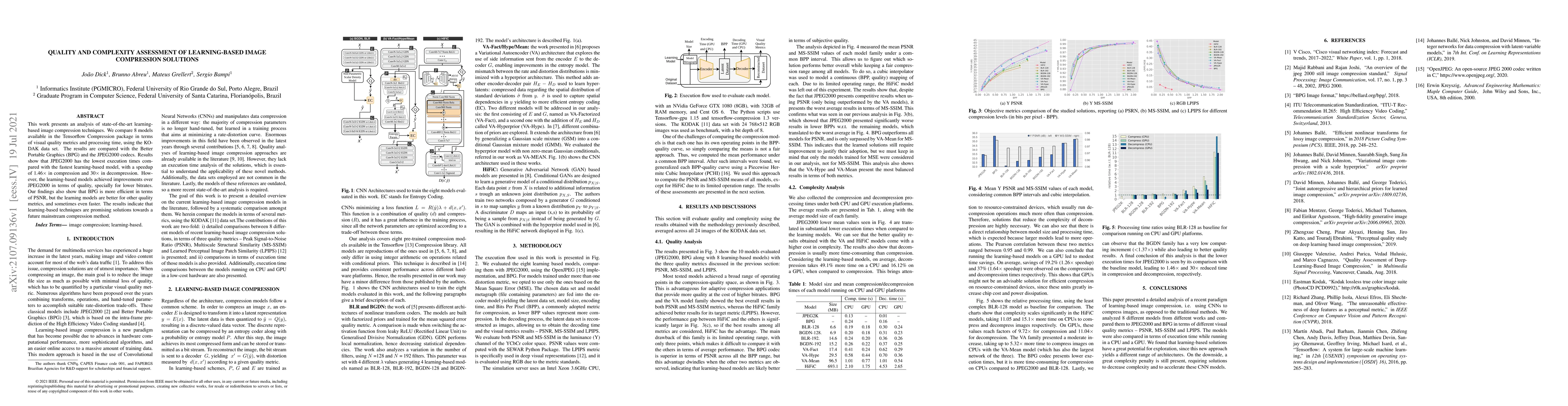 This work presents an analysis of state-of-the-art learning-based image compression techniques. We compare 8 models available in the Tensorflow Compression package in terms of visual quality metrics and processing time, using the KODAK data set. The results are compared with the Better Portable Graphics (BPG) and the JPEG2000 codecs. Results show that JPEG2000 has the lowest execution times compared with the fastest learning-based model, with a speedup of 1.46x in compression and 30x in decompression. However, the learning-based models achieved improvements over JPEG2000 in terms of quality, specially for lower bitrates. Our findings also show that BPG is more efficient in terms of PSNR, but the learning models are better for other quality metrics, and sometimes even faster. The results indicate that learning-based techniques are promising solutions towards a future mainstream compression method.