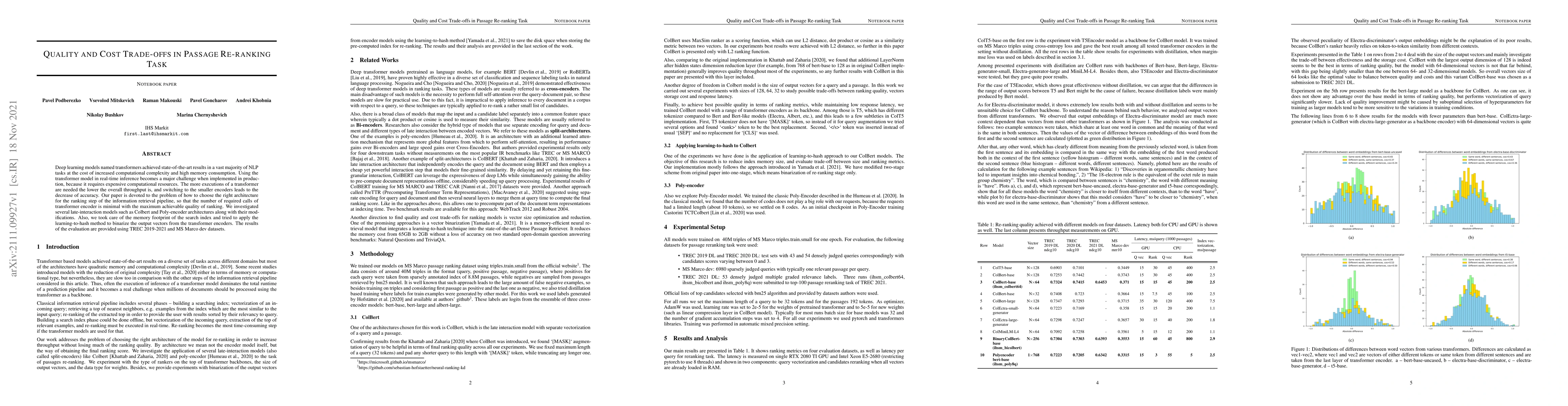 Deep learning models named transformers achieved state-of-the-art results in a vast majority of NLP tasks at the cost of increased computational complexity and high memory consumption. Using the transformer model in real-time inference becomes a major challenge when implemented in production, because it requires expensive computational resources. The more executions of a transformer are needed the lower the overall throughput is, and switching to the smaller encoders leads to the decrease of accuracy. Our paper is devoted to the problem of how to choose the right architecture for the ranking step of the information retrieval pipeline, so that the number of required calls of transformer encoder is minimal with the maximum achievable quality of ranking. We investigated several late-interaction models such as Colbert and Poly-encoder architectures along with their modifications. Also, we took care of the memory footprint of the search index and tried to apply the learning-to-hash method to binarize the output vectors from the transformer encoders. The results of the evaluation are provided using TREC 2019-2021 and MS Marco dev datasets.