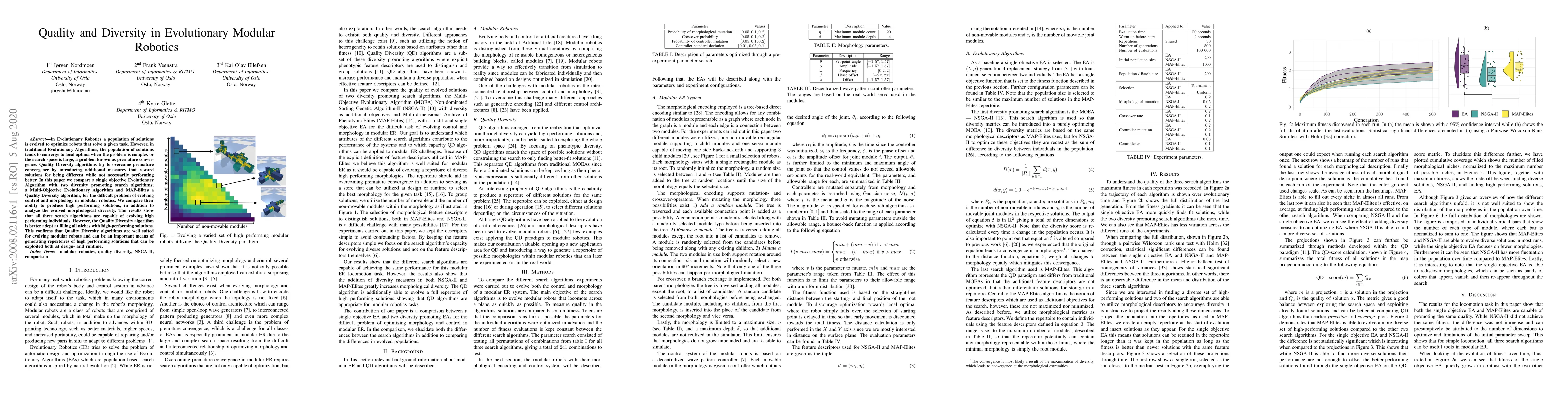 In Evolutionary Robotics a population of solutions is evolved to optimize robots that solve a given task. However, in traditional Evolutionary Algorithms, the population of solutions tends to converge to local optima when the problem is complex or the search space is large, a problem known as premature convergence. Quality Diversity algorithms try to overcome premature convergence by introducing additional measures that reward solutions for being different while not necessarily performing better. In this paper we compare a single objective Evolutionary Algorithm with two diversity promoting search algorithms; a Multi-Objective Evolutionary Algorithm and MAP-Elites a Quality Diversity algorithm, for the difficult problem of evolving control and morphology in modular robotics. We compare their ability to produce high performing solutions, in addition to analyze the evolved morphological diversity. The results show that all three search algorithms are capable of evolving high performing individuals. However, the Quality Diversity algorithm is better adept at filling all niches with high-performing solutions. This confirms that Quality Diversity algorithms are well suited for evolving modular robots and can be an important means of generating repertoires of high performing solutions that can be exploited both at design- and runtime.