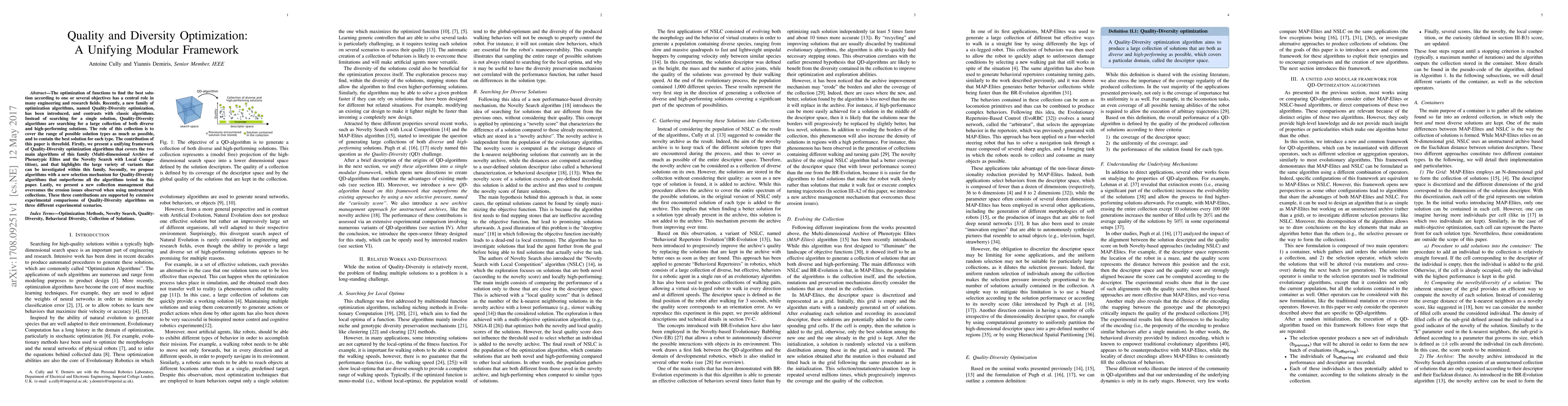This paper introduces a unifying modular framework for Quality-Diversity optimization algorithms, encompassing Multi-dimensional Archive of Phenotypic Elites and Novelty Search with Local Competition. It also proposes a new selection mechanism and collection management that outperform existing methods, supported by extensive experimental validation.
