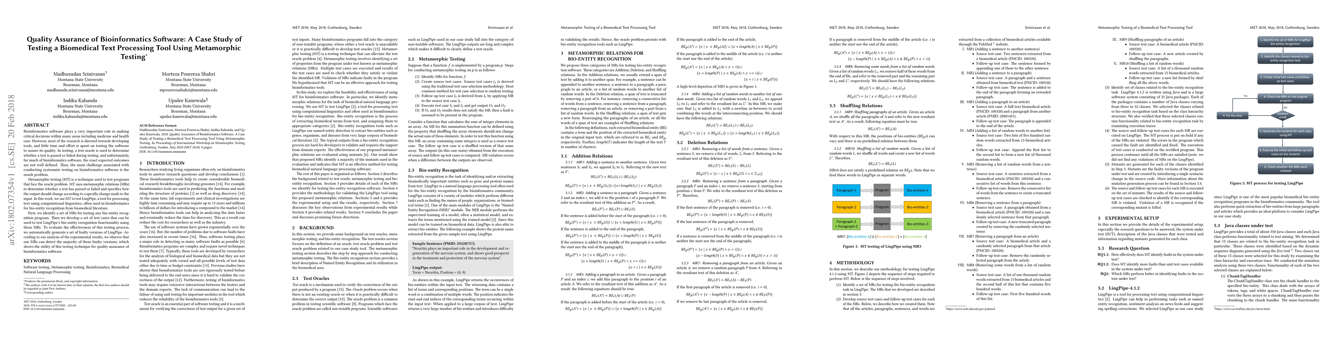 This paper explores the use of metamorphic testing to ensure the quality of bioinformatics software, specifically focusing on the LingPipe tool for bio-entity recognition. The study identifies metamorphic relations to test the software, demonstrating that this approach effectively detects faults in faulty versions of LingPipe, thus offering a viable solution to the oracle problem in bioinformatics software testing.