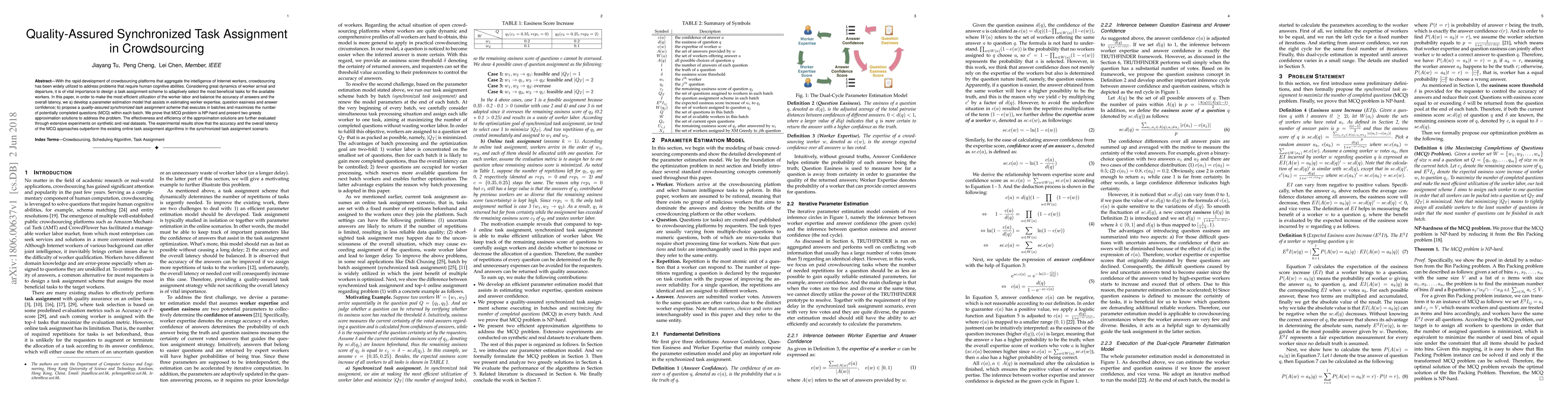This paper develops a parameter estimation model to estimate worker expertise and proposes a quality-assured synchronized task assignment scheme to maximize completed questions, presenting two greedy solutions to an NP-hard problem. Experiments show improved accuracy and latency compared to existing online task assignment algorithms.
