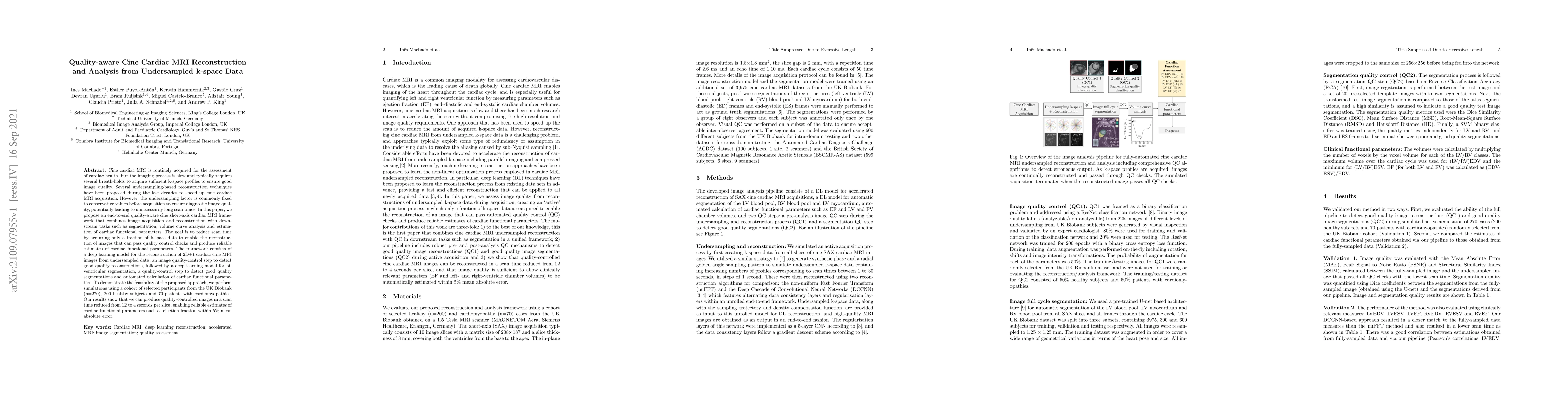 This paper proposes a quality-aware framework for reconstructing and analyzing cine cardiac MRI from undersampled k-space data, enabling faster scans while maintaining diagnostic image quality and reliable cardiac function estimates. The framework integrates deep learning models for image reconstruction, quality control, segmentation, and functional parameter calculation.