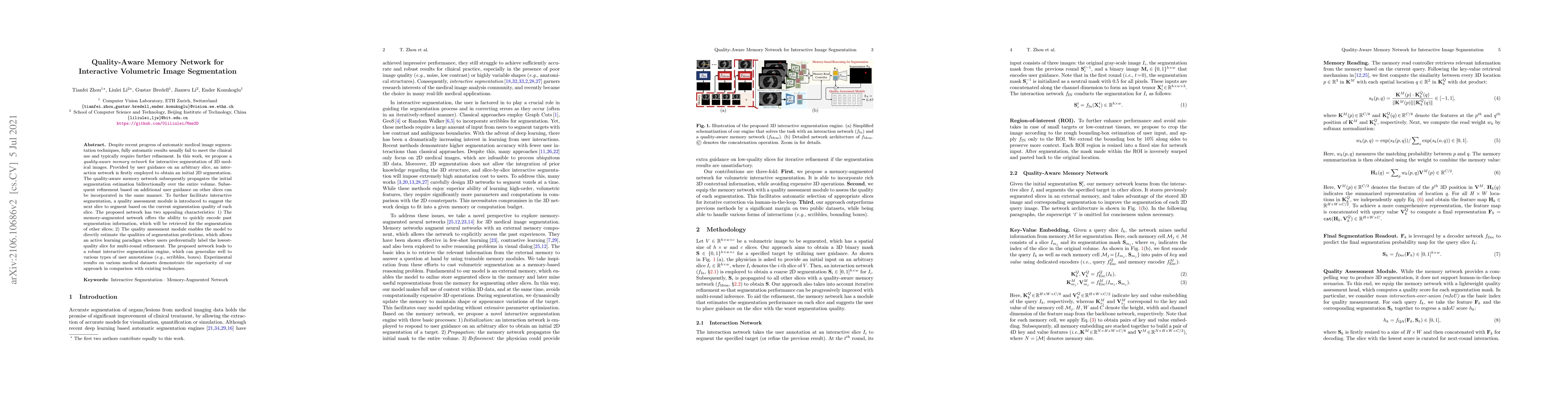 This paper proposes a quality-aware memory network for interactive volumetric image segmentation, utilizing user guidance to refine initial 2D segmentations across 3D medical images. The network features a quality assessment module to suggest the next slice for refinement based on the current segmentation quality.