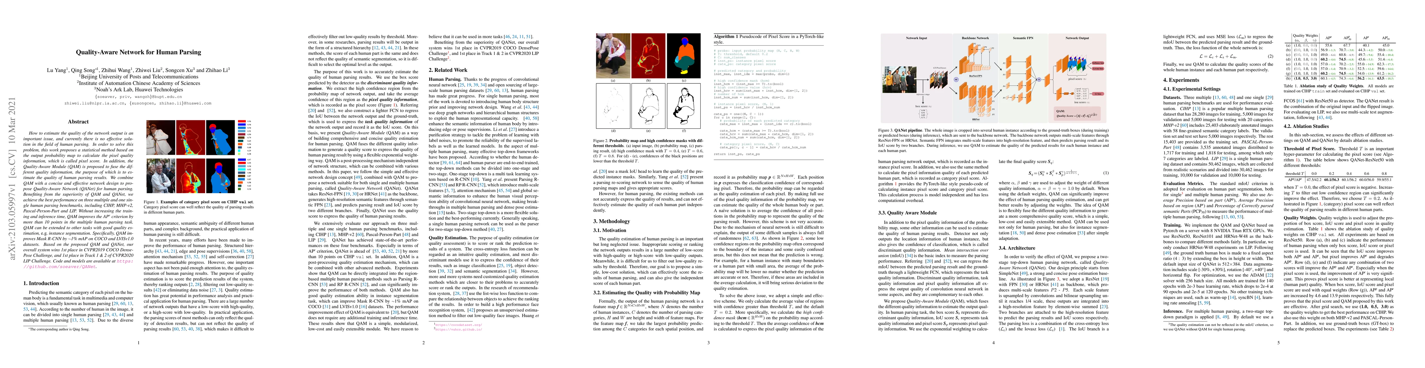This paper proposes a Quality-Aware Network (QANet) for human parsing, incorporating a Quality-Aware Module (QAM) to estimate the quality of parsing results using a pixel score derived from output probability maps. QANet achieves top performance on multiple benchmarks without increasing training or inference time.