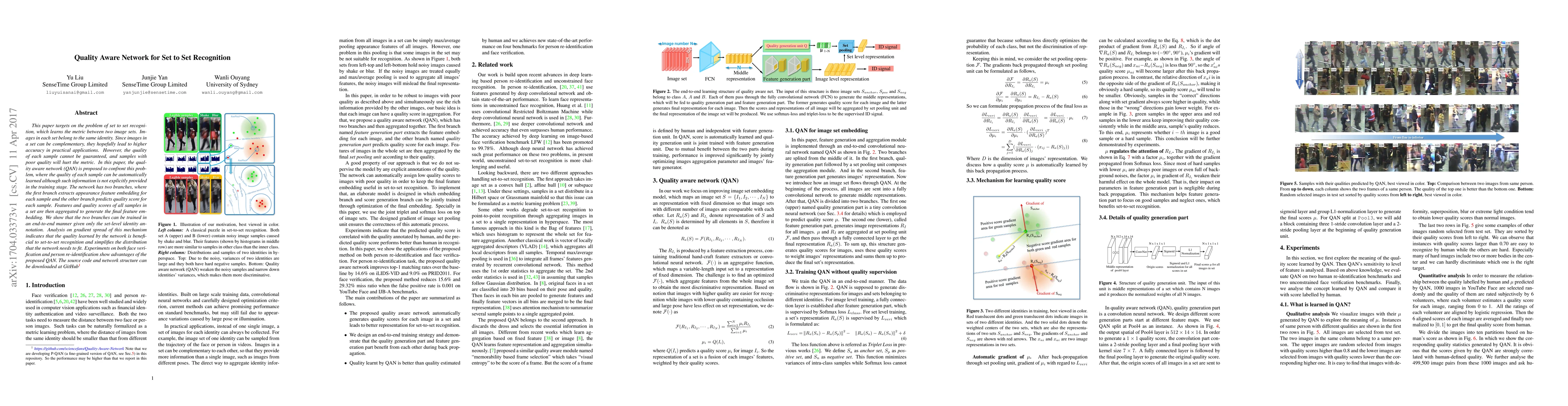 This research introduces Quality Aware Network (QAN) for set-to-set image recognition, addressing the issue of varying sample quality. QAN has two branches: one extracts appearance features and the other predicts quality scores. Both branches are trained end-to-end using set-level identity annotations. Experiments on face verification and person re-identification demonstrate QAN's effectiveness.