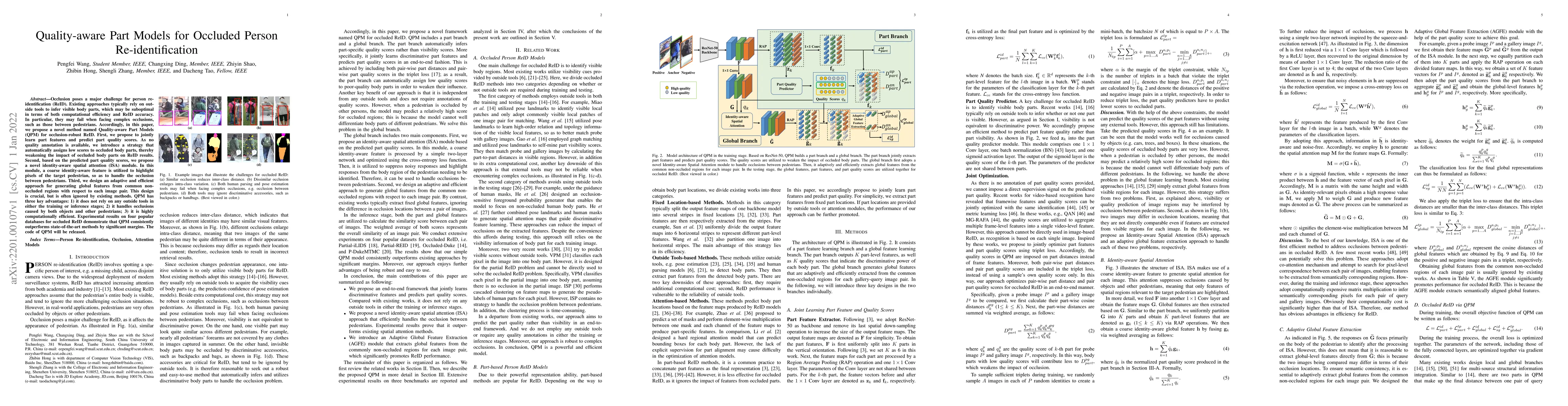 The paper introduces Quality-aware Part Models (QPM) for robust person re-identification under occlusion. QPM jointly learns part features and predicts part quality scores, automatically assigning low scores to occluded parts. It also proposes an identity-aware spatial attention module and an adaptive global feature generation approach. QPM outperforms existing methods, handling occlusions from various sources efficiently without relying on external tools.