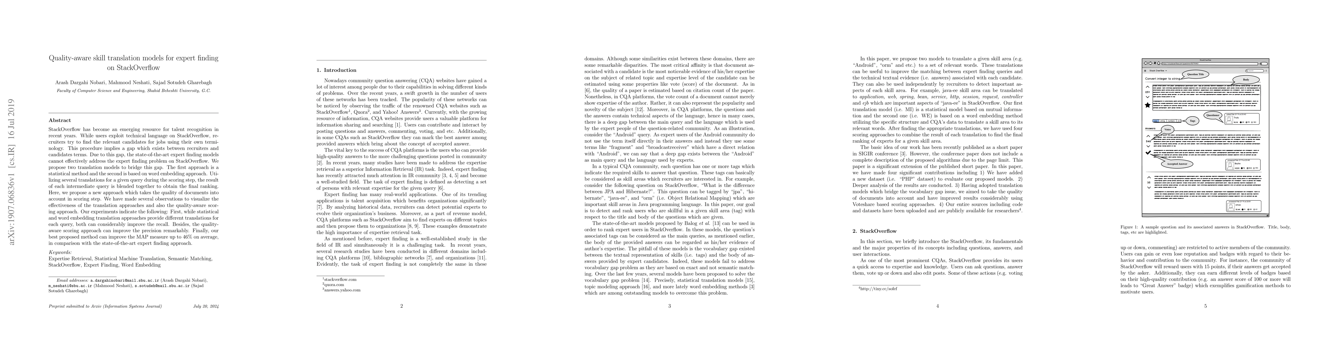 StackOverflow has become an emerging resource for talent recognition in recent years. While users exploit technical language on StackOverflow, recruiters try to find the relevant candidates for jobs using their own terminology. This procedure implies a gap which exists between recruiters and candidates terms. Due to this gap, the state-of-the-art expert finding models cannot effectively address the expert finding problem on StackOverflow. We propose two translation models to bridge this gap. The first approach is a statistical method and the second is based on word embedding approach. Utilizing several translations for a given query during the scoring step, the result of each intermediate query is blended together to obtain the final ranking. Here, we propose a new approach which takes the quality of documents into account in scoring step. We have made several observations to visualize the effectiveness of the translation approaches and also the quality-aware scoring approach. Our experiments indicate the following: First, while statistical and word embedding translation approaches provide different translations for each query, both can considerably improve the recall. Besides, the quality-aware scoring approach can improve the precision remarkably. Finally, our best proposed method can improve the MAP measure up to 46% on average, in comparison with the state-of-the-art expert finding approach.
