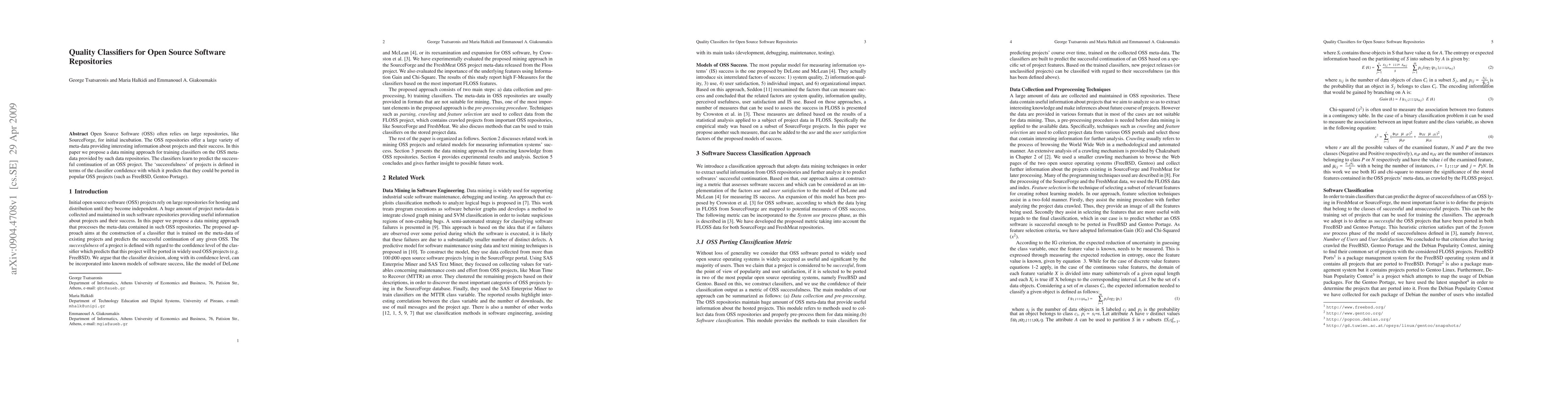 This paper proposes a data mining approach to train classifiers using metadata from open source software repositories to predict the successful continuation of projects, defined by their potential to be ported into popular OSS projects like FreeBSD and Gentoo Portage. The study aims to leverage repository data to enhance understanding of project viability.