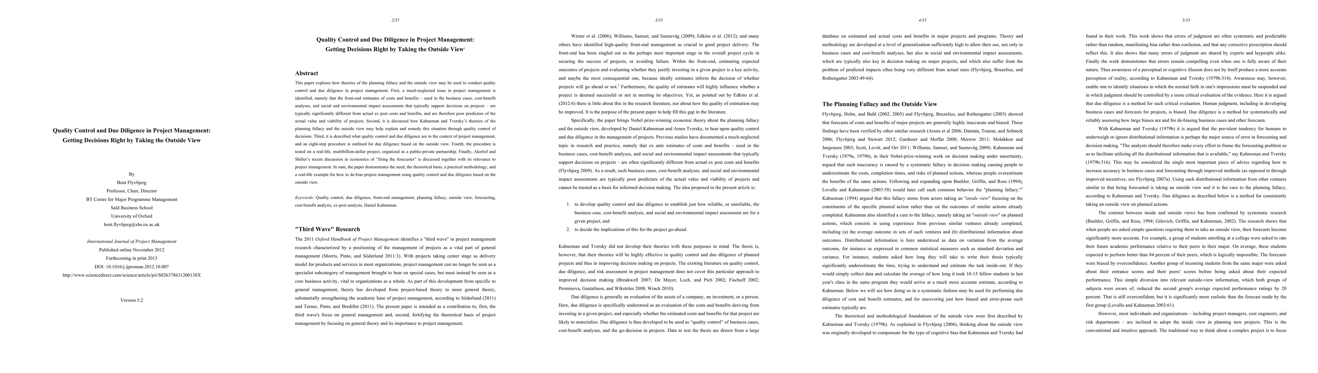 This paper explores how theories of the planning fallacy and the outside view may be used to conduct quality control and due diligence in project management. First, a much-neglected issue in project management is identified, namely that the front-end estimates of costs and benefits--used in the business cases, cost-benefit analyses, and social and environmental impact assessments that typically support decisions on projects--are typically significantly different from actual ex post costs and benefits, and are therefore poor predictors of the actual value and viability of projects. Second, it is discussed how Kahneman and Tversky's theories of the planning fallacy and the outside view may help explain and remedy this situation through quality control of decisions. Third, it is described what quality control and due diligence are in the context of project management, and an eight-step procedure is outlined for due diligence based on the outside view. Fourth, the procedure is tested on a real-life, multibillion-dollar project, organized as a public-private partnership. Finally, Akerlof and Shiller's recent discussion in economics of "firing the forecaster" is discussed together with its relevance to project management. In sum, the paper demonstrates the need, the theoretical basis, a practical methodology, and a real-life example for how to de-bias project management using quality control and due diligence based on the outside view.