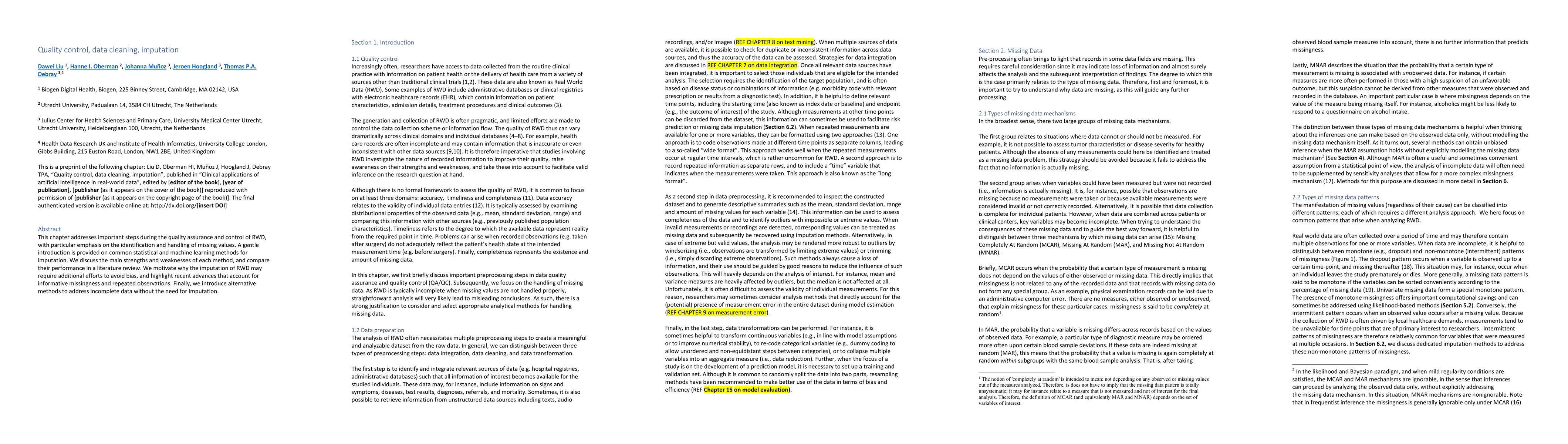 This chapter addresses important steps during the quality assurance and control of RWD, with particular emphasis on the identification and handling of missing values. A gentle introduction is provided on common statistical and machine learning methods for imputation. We discuss the main strengths and weaknesses of each method, and compare their performance in a literature review. We motivate why the imputation of RWD may require additional efforts to avoid bias, and highlight recent advances that account for informative missingness and repeated observations. Finally, we introduce alternative methods to address incomplete data without the need for imputation.