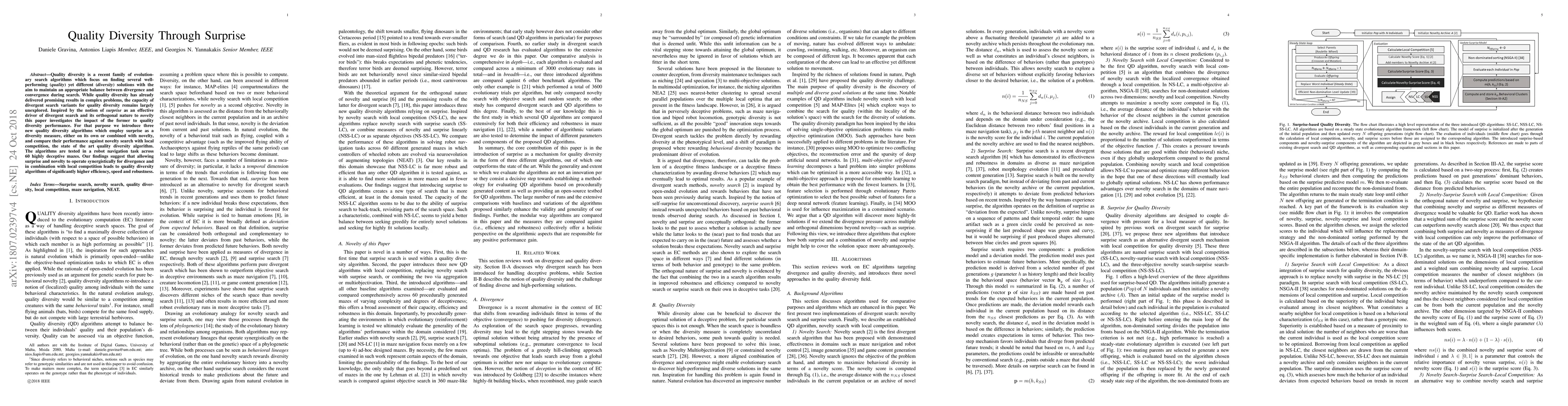 This paper explores the integration of surprise as a diversity measure in quality diversity algorithms, proposing three new algorithms to balance divergence and convergence. The results from testing on robot navigation tasks show that combining surprise with novelty and local competition enhances efficiency, speed, and robustness compared to traditional novelty search.