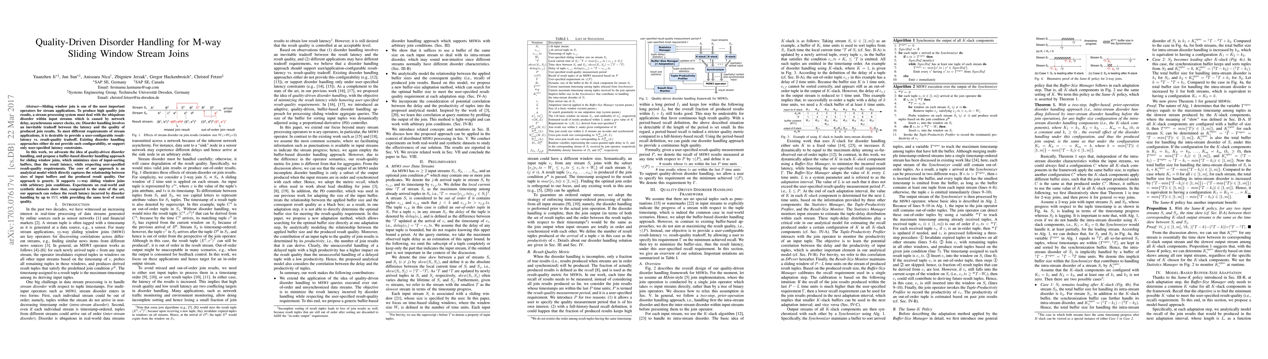 This paper proposes a quality-driven disorder handling method for m-way sliding window stream joins, aiming to minimize latency while respecting user-specified quality requirements. The approach employs an analytical model to manage input buffers efficiently, significantly reducing result latency by up to 95% compared to existing methods.