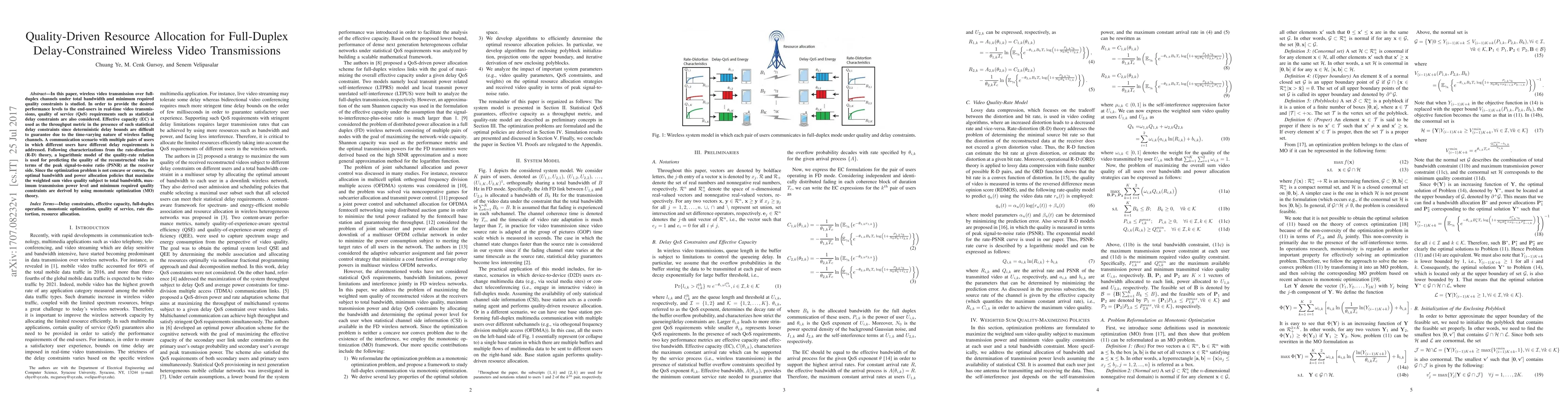This paper studies wireless video transmission over full-duplex channels with constraints on bandwidth and quality, employing effective capacity to measure throughput under statistical delay constraints. It derives optimal bandwidth and power allocation policies using monotonic optimization to maximize video quality for multiple users with varying delay requirements.