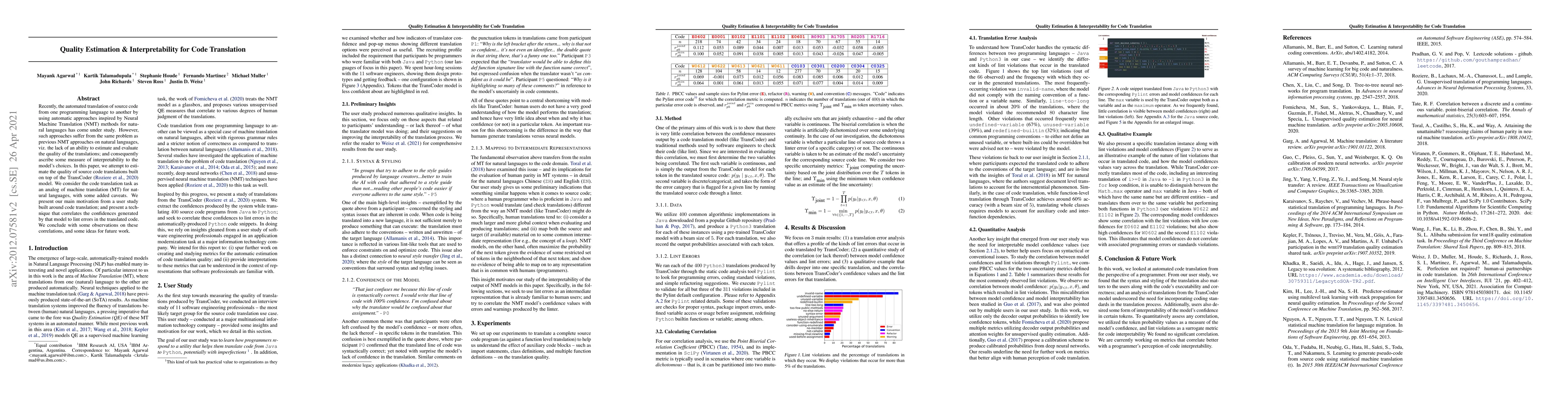 Recently, the automated translation of source code from one programming language to another by using automatic approaches inspired by Neural Machine Translation (NMT) methods for natural languages has come under study. However, such approaches suffer from the same problem as previous NMT approaches on natural languages, viz. the lack of an ability to estimate and evaluate the quality of the translations; and consequently ascribe some measure of interpretability to the model's choices. In this paper, we attempt to estimate the quality of source code translations built on top of the TransCoder model. We consider the code translation task as an analog of machine translation (MT) for natural languages, with some added caveats. We present our main motivation from a user study built around code translation; and present a technique that correlates the confidences generated by that model to lint errors in the translated code. We conclude with some observations on these correlations, and some ideas for future work.