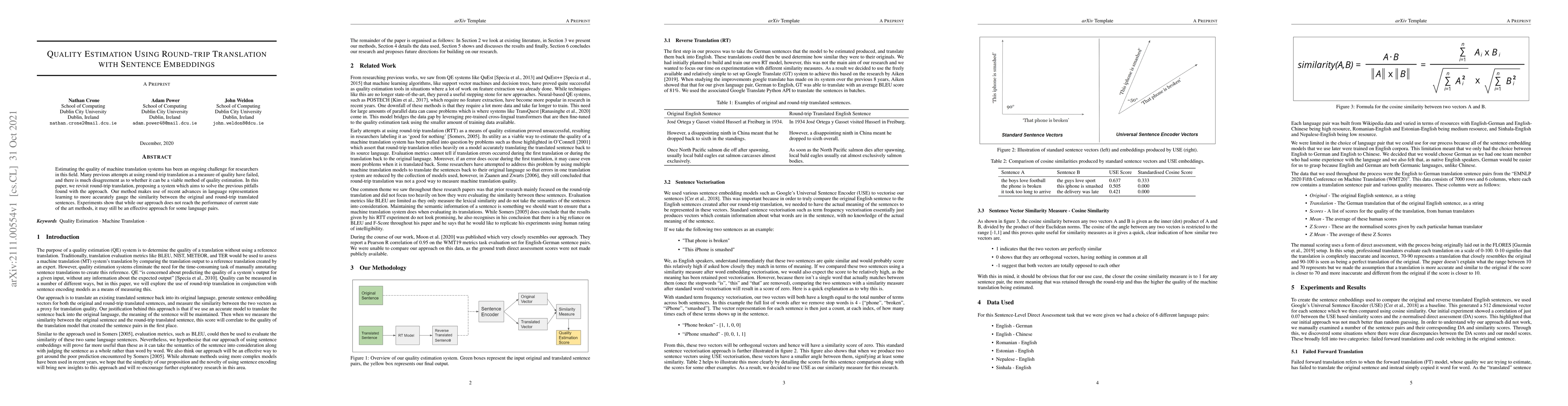 The paper proposes a novel approach using round-trip translation with sentence embeddings for quality estimation of machine translation systems. It employs Google's Universal Sentence Encoder (USE) to generate 512-dimensional sentence vectors, compared using cosine similarity. The method was tested on six language pairs, with data sourced from EMNLP2020 WMT20 sentence pairs.