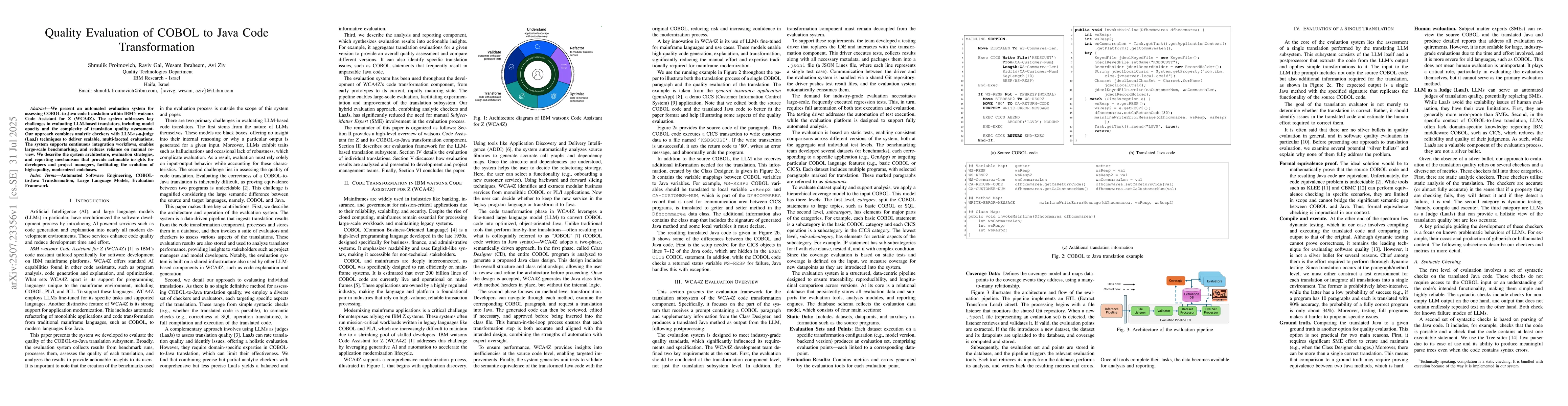 We present an automated evaluation system for assessing COBOL-to-Java code translation within IBM's watsonx Code Assistant for Z (WCA4Z). The system addresses key challenges in evaluating LLM-based translators, including model opacity and the complexity of translation quality assessment. Our approach combines analytic checkers with LLM-as-a-judge (LaaJ) techniques to deliver scalable, multi-faceted evaluations. The system supports continuous integration workflows, enables large-scale benchmarking, and reduces reliance on manual review. We describe the system architecture, evaluation strategies, and reporting mechanisms that provide actionable insights for developers and project managers, facilitating the evolution of high-quality, modernized codebases.