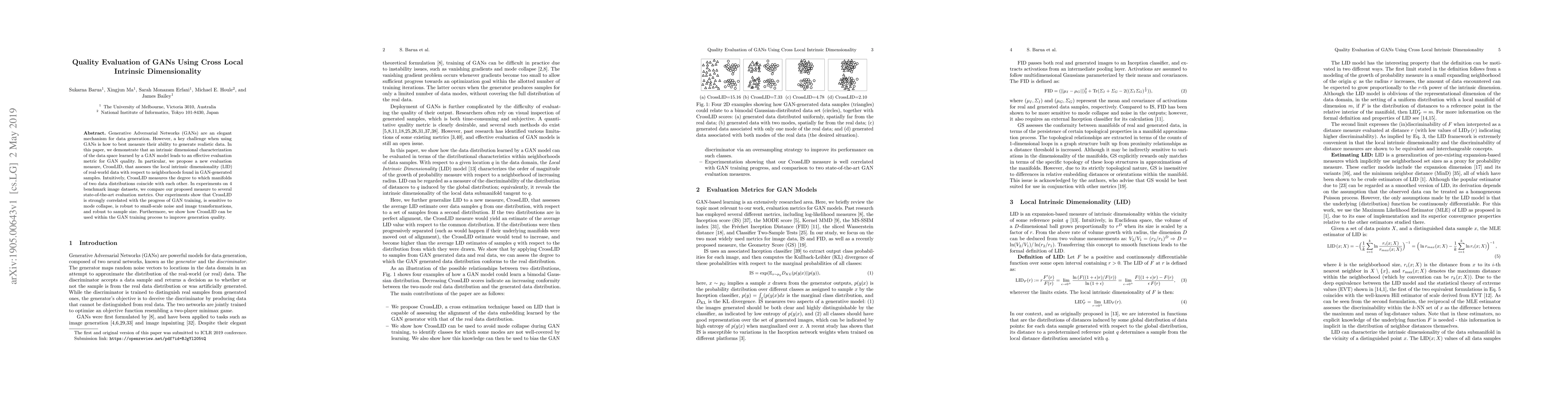 This paper proposes CrossLID, a new evaluation metric for GANs based on the intrinsic dimensional characterization of data space, demonstrating its effectiveness in measuring GAN quality through local intrinsic dimensionality comparison. Experiments show CrossLID correlates well with GAN training progress and improves generation quality.