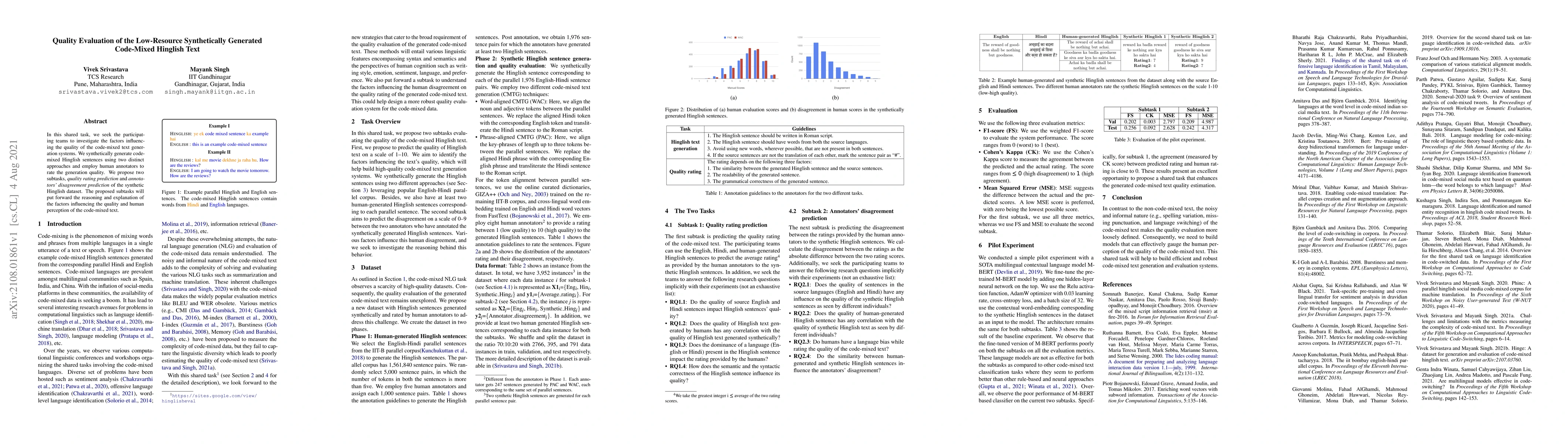 This research evaluates the quality of synthetically generated code-mixed Hinglish text using human annotators. It proposes two subtasks: quality rating prediction and annotators' disagreement prediction to identify factors influencing the quality and human perception of the generated text.
