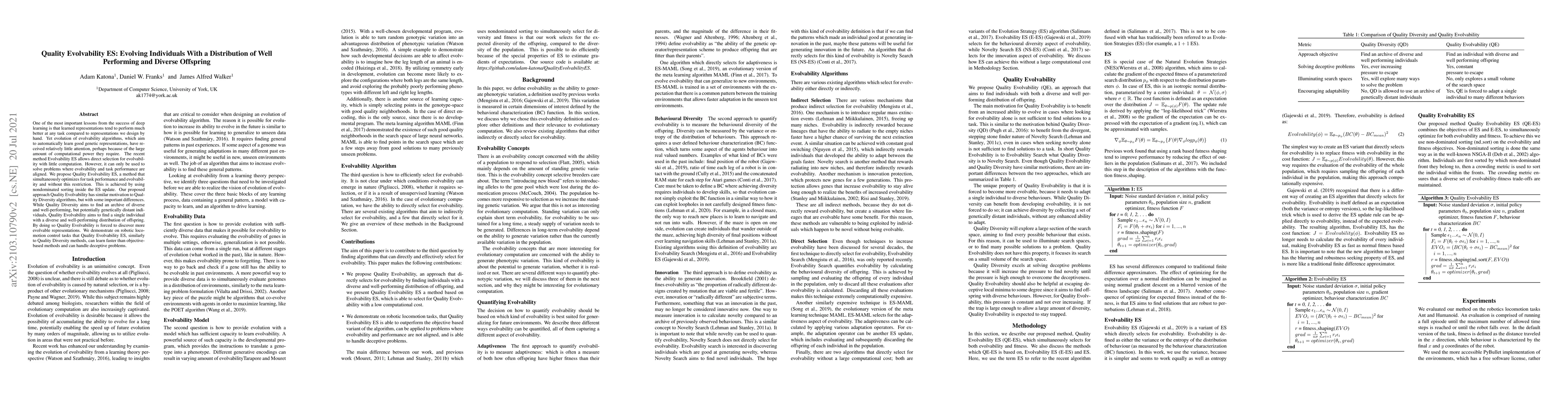 The paper proposes Quality Evolvability ES, a method to optimize both task performance and evolvability without aligning them, contrasting with previous methods. It aims to find a single individual with diverse and well-performing offspring, thereby discovering more evolvable representations, and demonstrates its effectiveness on robotic locomotion control tasks.