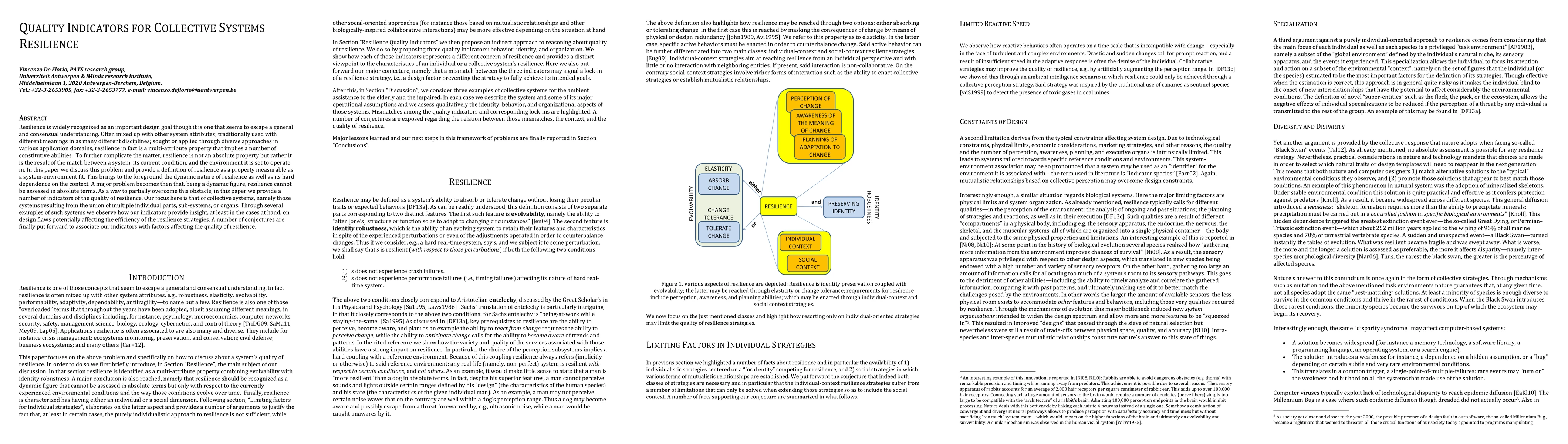 This paper defines resilience as a dynamic, context-dependent system-environment fit and proposes quality indicators to assess resilience in collective systems. It highlights design flaws that may affect resilience strategies and suggests associations between these indicators and factors influencing resilience quality.