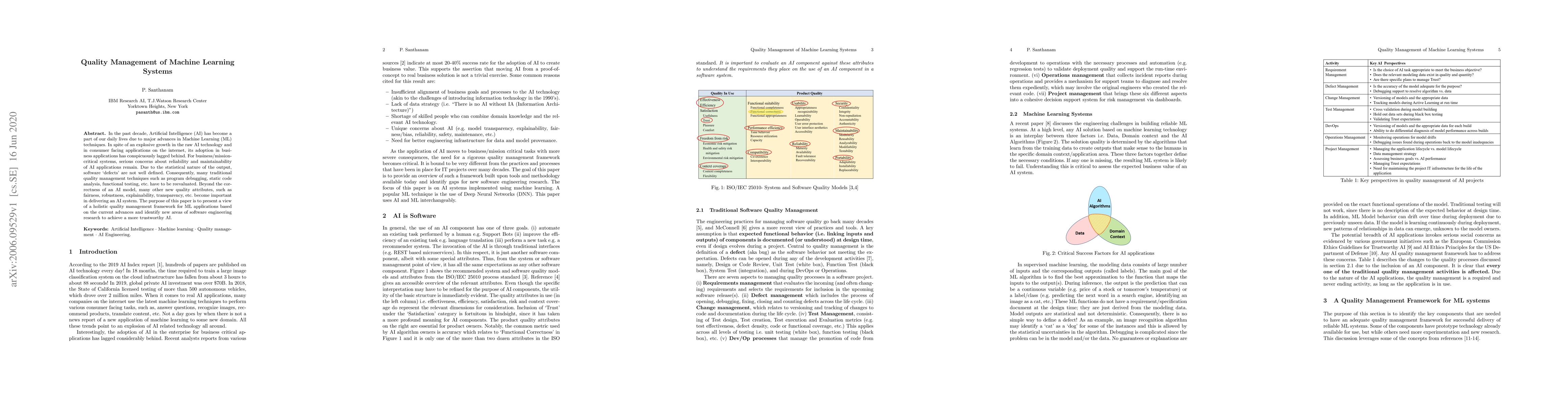 In the past decade, Artificial Intelligence (AI) has become a part of our daily lives due to major advances in Machine Learning (ML) techniques. In spite of an explosive growth in the raw AI technology and in consumer facing applications on the internet, its adoption in business applications has conspicuously lagged behind. For business/mission-critical systems, serious concerns about reliability and maintainability of AI applications remain. Due to the statistical nature of the output, software 'defects' are not well defined. Consequently, many traditional quality management techniques such as program debugging, static code analysis, functional testing, etc. have to be reevaluated. Beyond the correctness of an AI model, many other new quality attributes, such as fairness, robustness, explainability, transparency, etc. become important in delivering an AI system. The purpose of this paper is to present a view of a holistic quality management framework for ML applications based on the current advances and identify new areas of software engineering research to achieve a more trustworthy AI.