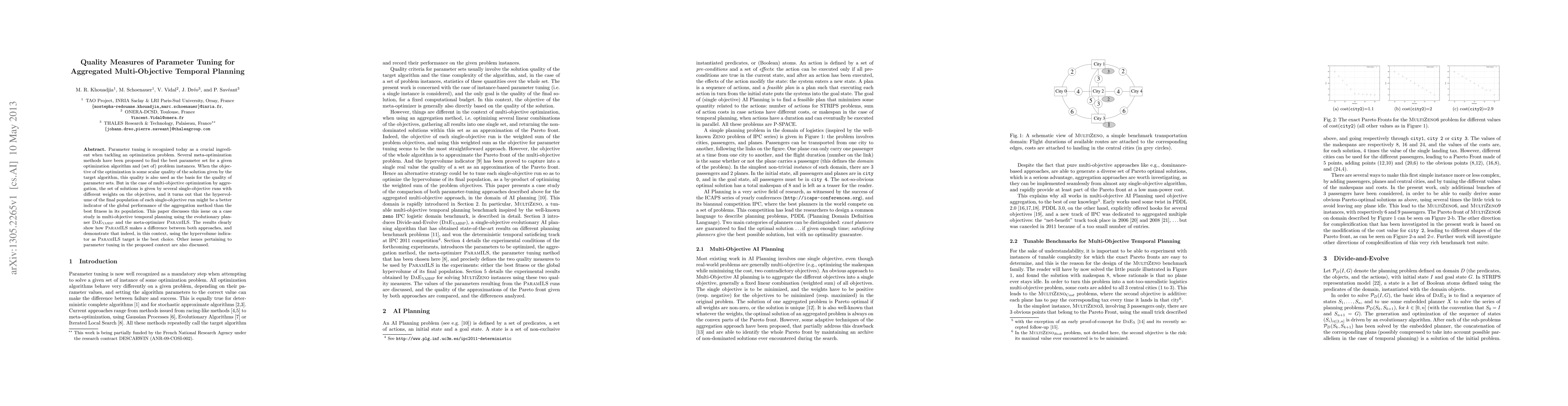 This paper investigates parameter tuning for aggregated multi-objective temporal planning, focusing on the effectiveness of hypervolume as a performance indicator compared to best fitness. Using DaE-YAHSP and ParamILS, it finds that hypervolume better reflects global performance, demonstrating ParamILS's superiority in this context.