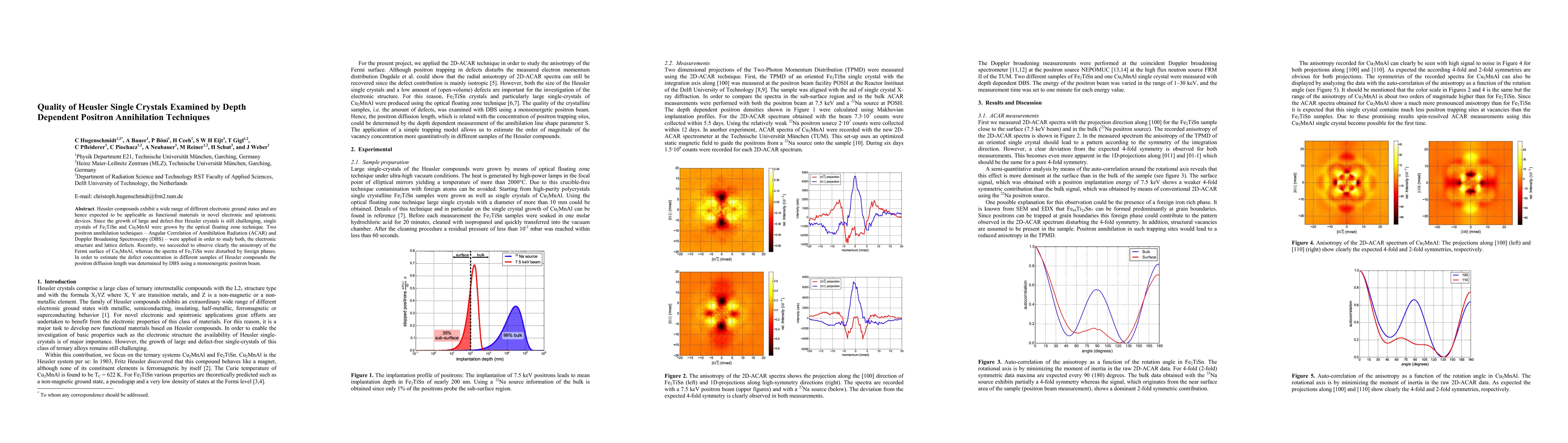This study investigates the quality of Fe2TiSn and Cu2MnAl Heusler single crystals using depth-dependent positron annihilation techniques. The research successfully reveals the anisotropy of the Fermi surface in Cu2MnAl, while Fe2TiSn is affected by foreign phases, highlighting the importance of crystal quality for electronic applications.