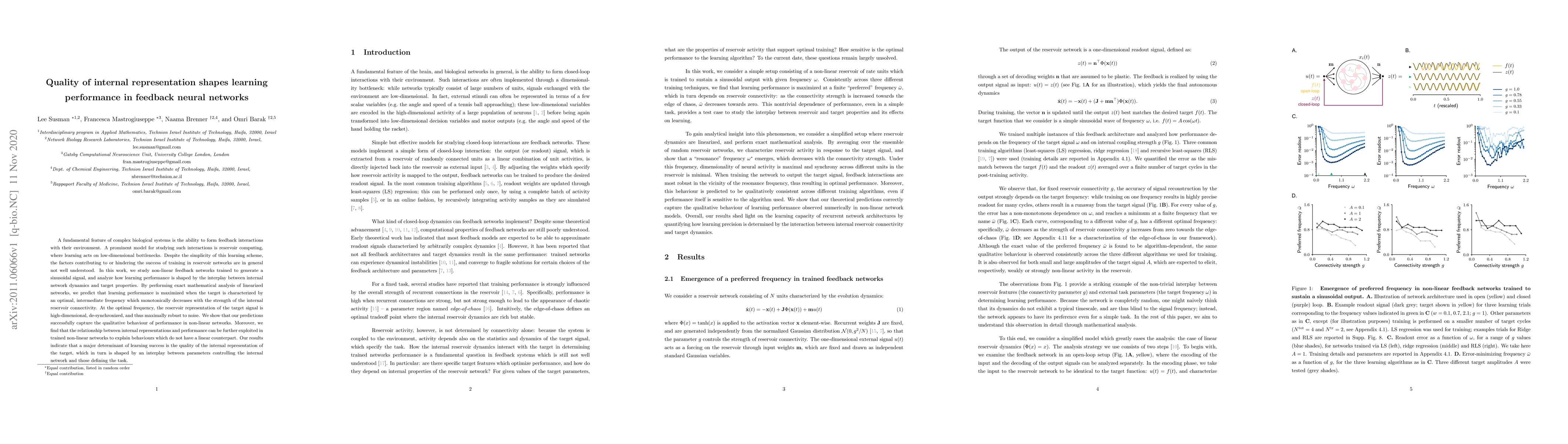 A study found that the quality of internal representation in feedback neural networks significantly impacts learning performance, with optimal representations being high-dimensional and robust to noise.
