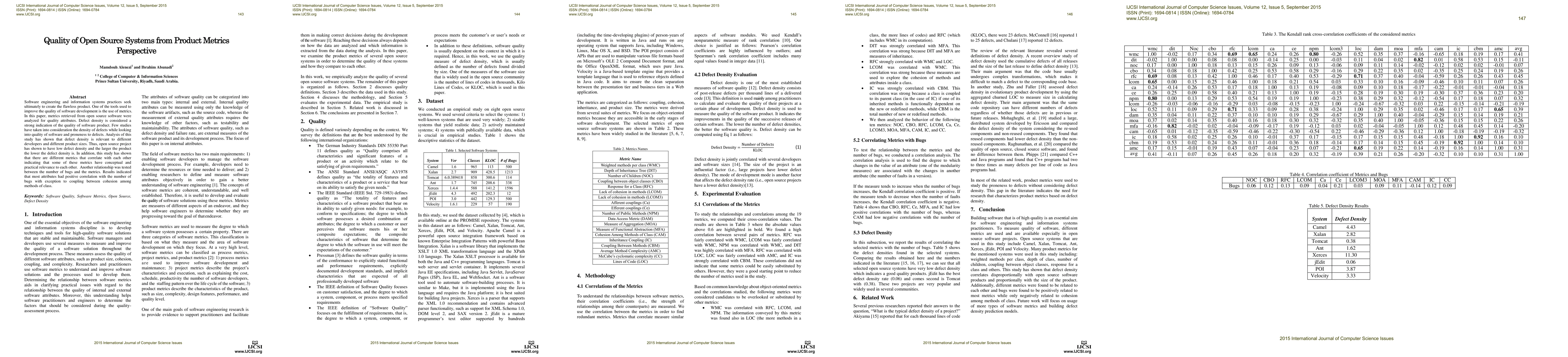 Software engineering and information systems practices seek ultimately to create the flawless product. One of the tools used to improve the quality of software development is the use of metrics. In this paper, metrics retrieved from open source software were analyzed for quality attributes. Defect density is considered a strong indication of the quality of software product. Few studies have taken into consideration the density of defects while looking into quality of software and proneness to defects. Analysis of this study has shown that defect density is relevant to different developers and different product sizes. Thus, open source project has shown to have low defect density and the larger the product the lower the defect density is. In addition, this study has shown that there are different metrics that correlate with each other indicating that some of these metrics have conceptual and practical relevance to each other. Another relationship was tested between the number of bugs and the metrics. Results indicated that most attributes had positive correlation with the number of bugs with exception to coupling between cohesion among methods of class.
