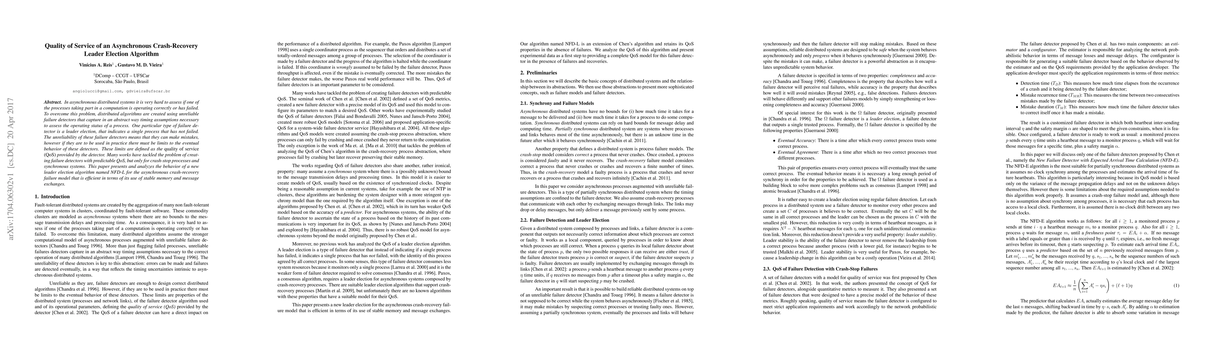 This paper introduces NFD-L, a new leader election algorithm designed for asynchronous distributed systems with crash-recovery processes, focusing on providing predictable quality of service (QoS) despite the unreliability of failure detectors. The algorithm aims to efficiently use stable memory and message exchanges.