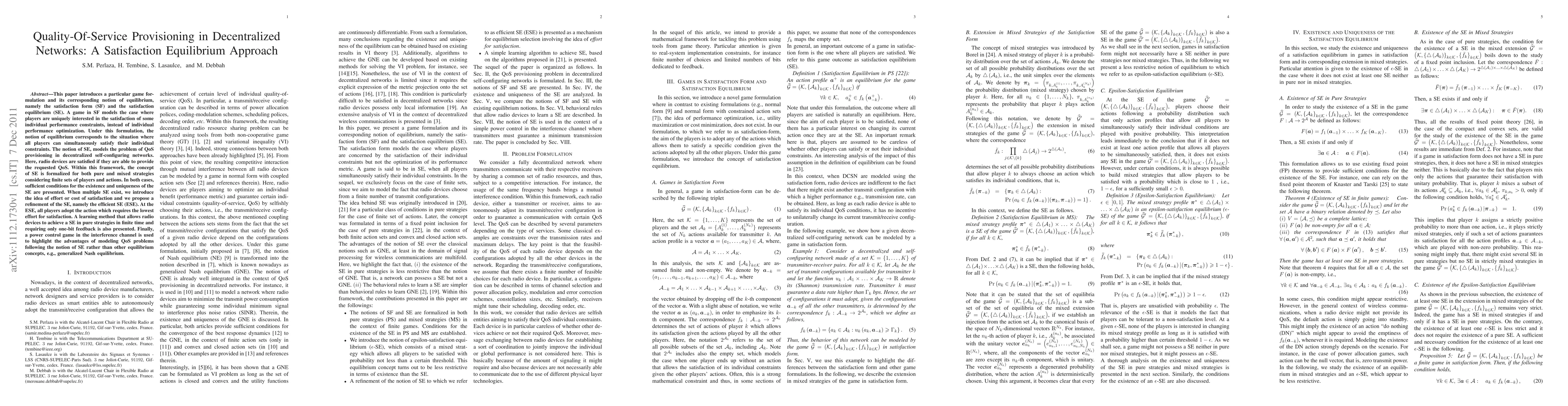 This paper introduces a particular game formulation and its corresponding notion of equilibrium, namely the satisfaction form (SF) and the satisfaction equilibrium (SE). A game in SF models the case where players are uniquely interested in the satisfaction of some individual performance constraints, instead of individual performance optimization. Under this formulation, the notion of equilibrium corresponds to the situation where all players can simultaneously satisfy their individual constraints. The notion of SE, models the problem of QoS provisioning in decentralized self-configuring networks. Here, radio devices are satisfied if they are able to provide the requested QoS. Within this framework, the concept of SE is formalized for both pure and mixed strategies considering finite sets of players and actions. In both cases, sufficient conditions for the existence and uniqueness of the SE are presented. When multiple SE exist, we introduce the idea of effort or cost of satisfaction and we propose a refinement of the SE, namely the efficient SE (ESE). At the ESE, all players adopt the action which requires the lowest effort for satisfaction. A learning method that allows radio devices to achieve a SE in pure strategies in finite time and requiring only one-bit feedback is also presented. Finally, a power control game in the interference channel is used to highlight the advantages of modeling QoS problems following the notion of SE rather than other equilibrium concepts, e.g., generalized Nash equilibrium.