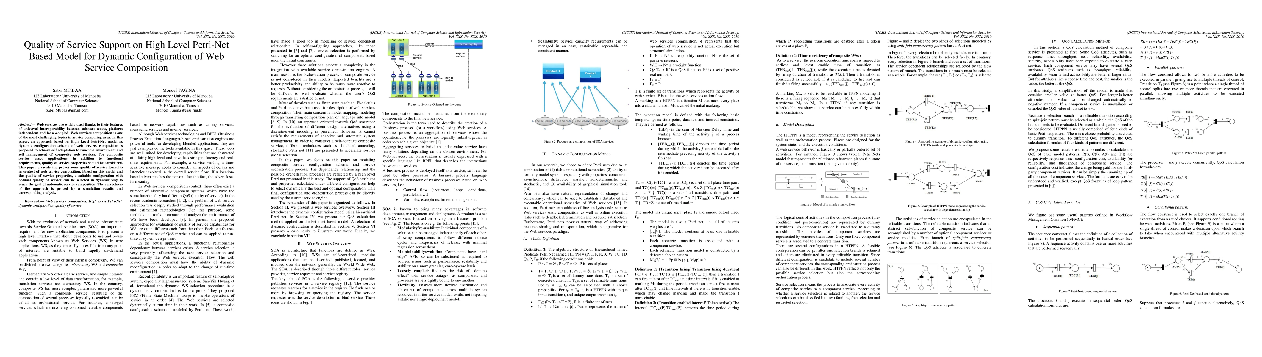 This paper proposes a High Level Petri-Net based model for dynamic configuration of web service composition, focusing on self-adaptation and management. The approach incorporates quality of service formulas to ensure optimal service configurations, validated through simulation and analysis.