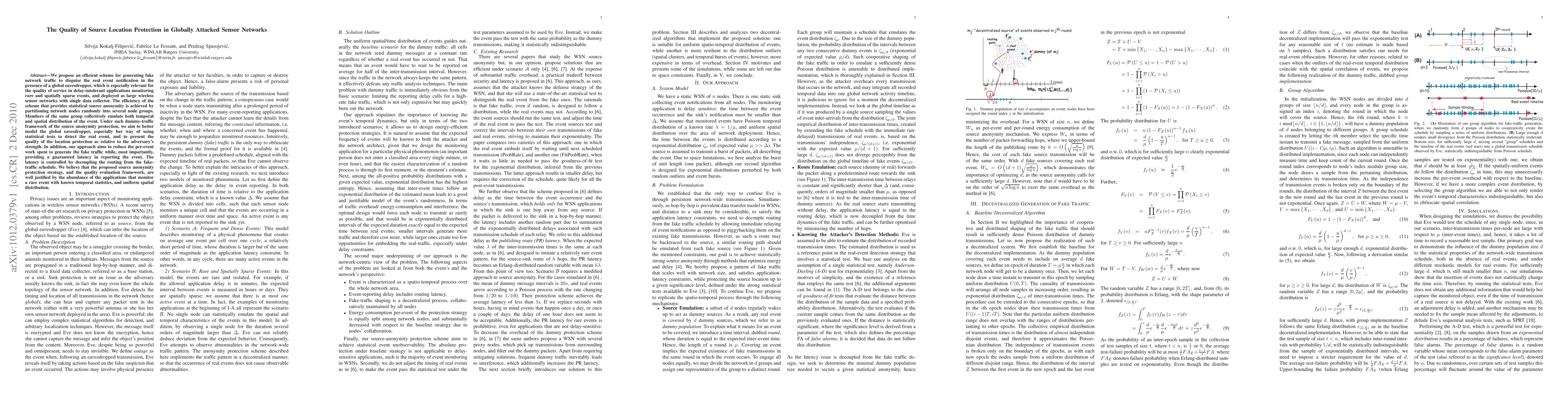 We propose an efficient scheme for generating fake network traffic to disguise the real event notification in the presence of a global eavesdropper, which is especially relevant for the quality of service in delay-intolerant applications monitoring rare and spatially sparse events, and deployed as large wireless sensor networks with single data collector. The efficiency of the scheme that provides statistical source anonymity is achieved by partitioning network nodes randomly into several node groups. Members of the same group collectively emulate both temporal and spatial distribution of the event. Under such dummy-traffic framework of the source anonymity protection, we aim to better model the global eavesdropper, especially her way of using statistical tests to detect the real event, and to present the quality of the location protection as relative to the adversary's strength. In addition, our approach aims to reduce the per-event work spent to generate the fake traffic while, most importantly, providing a guaranteed latency in reporting the event. The latency is controlled by decoupling the routing from the fake traffic schedule. We believe that the proposed source anonymity protection strategy, and the quality evaluation framework, are well justified by the abundance of the applications that monitor a rare event with known temporal statistics, and uniform spatial distribution.