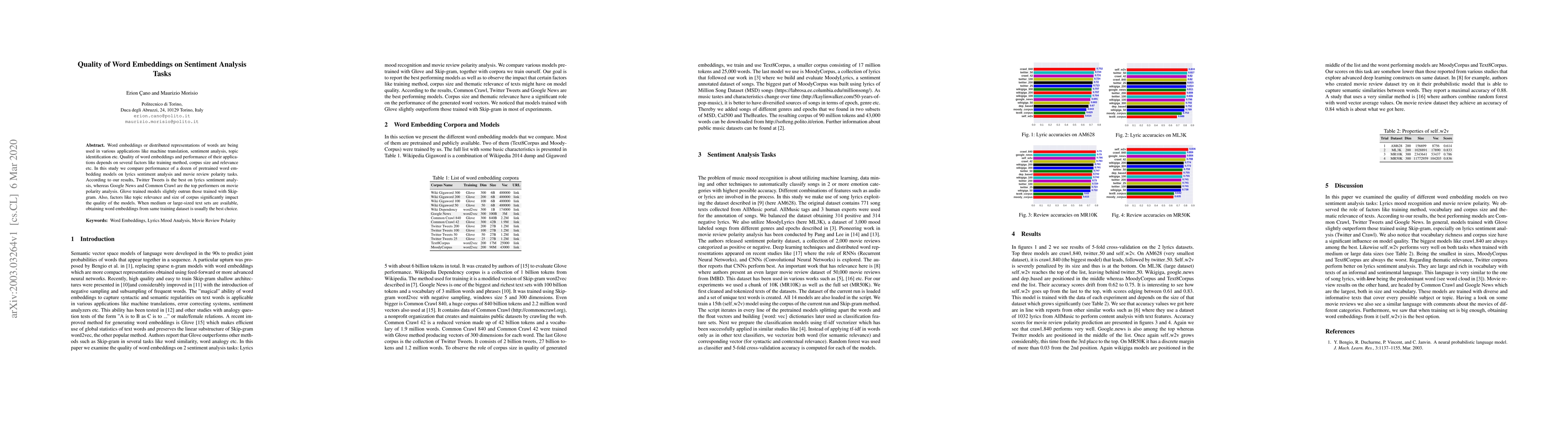 Word embeddings or distributed representations of words are being used in various applications like machine translation, sentiment analysis, topic identification etc. Quality of word embeddings and performance of their applications depends on several factors like training method, corpus size and relevance etc. In this study we compare performance of a dozen of pretrained word embedding models on lyrics sentiment analysis and movie review polarity tasks. According to our results, Twitter Tweets is the best on lyrics sentiment analysis, whereas Google News and Common Crawl are the top performers on movie polarity analysis. Glove trained models slightly outrun those trained with Skipgram. Also, factors like topic relevance and size of corpus significantly impact the quality of the models. When medium or large-sized text sets are available, obtaining word embeddings from same training dataset is usually the best choice.