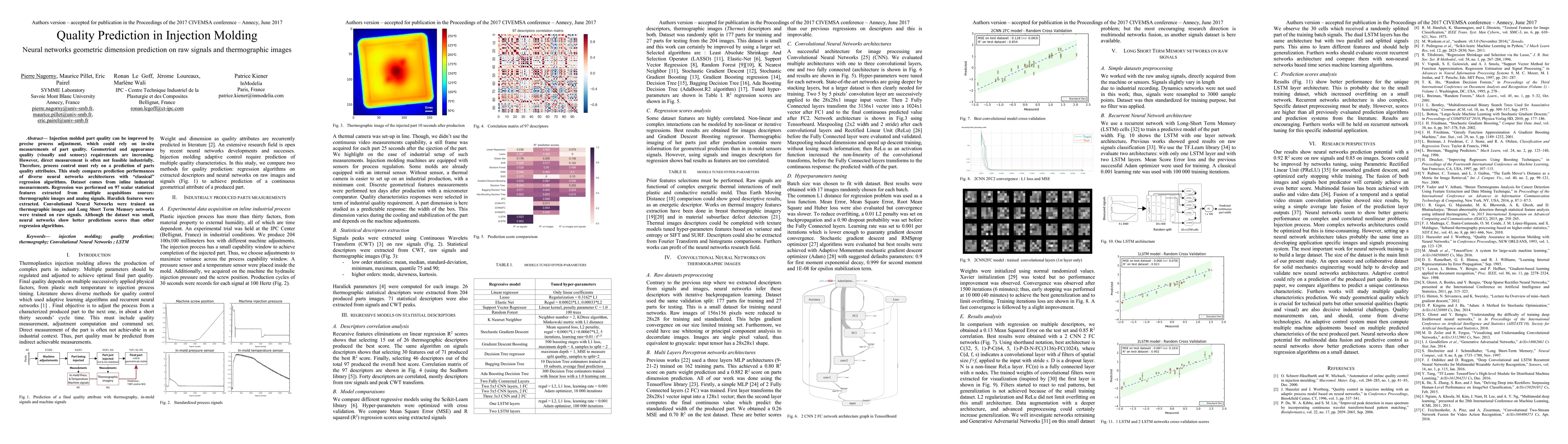 Injection molded part quality can be improved by precise process adjustment, which could rely on in-situ measurements of part quality. Geometrical and appearance quality (visually and sensory) requirements are increasing. However, direct measurement is often not feasible industrially. Therefore, process control must rely on a prediction of parts quality attributes. This study compares prediction performances of diverse neural networks architectures with "classical" regression algorithms. Dataset comes from inline industrial measurements. Regression was performed on 97 scalar statistical features extracted from multiple acquisitions sources: thermographic images and analog signals. Haralick features were extracted. Convolutional Neural Networks were trained on thermographic images and Long Short Term Memory networks were trained on raw signals. Although the dataset was small, neural networks show better predictions scores than other regression algorithms.