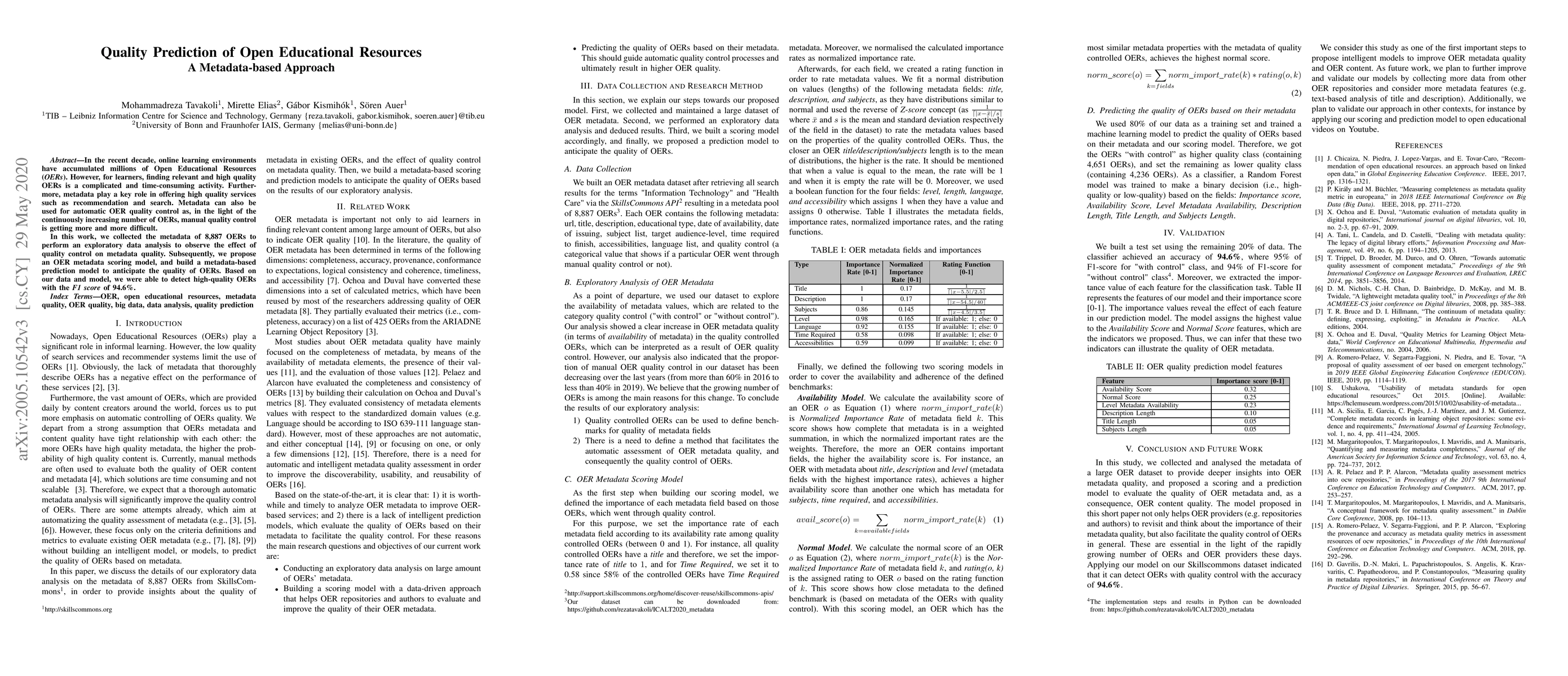 This paper explores the use of metadata to predict the quality of Open Educational Resources (OERs), proposing a metadata-based scoring model and prediction model that achieved an F1 score of 94.6% in detecting high-quality OERs. The study highlights the importance of metadata for automated quality control in the growing volume of OERs.